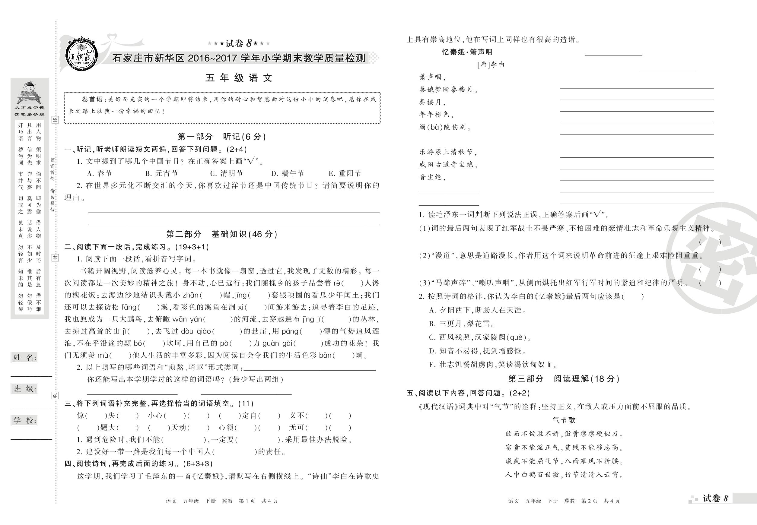 2016-2017学年第二学期石家庄市新华区五年级语文试卷(冀教版)【8】