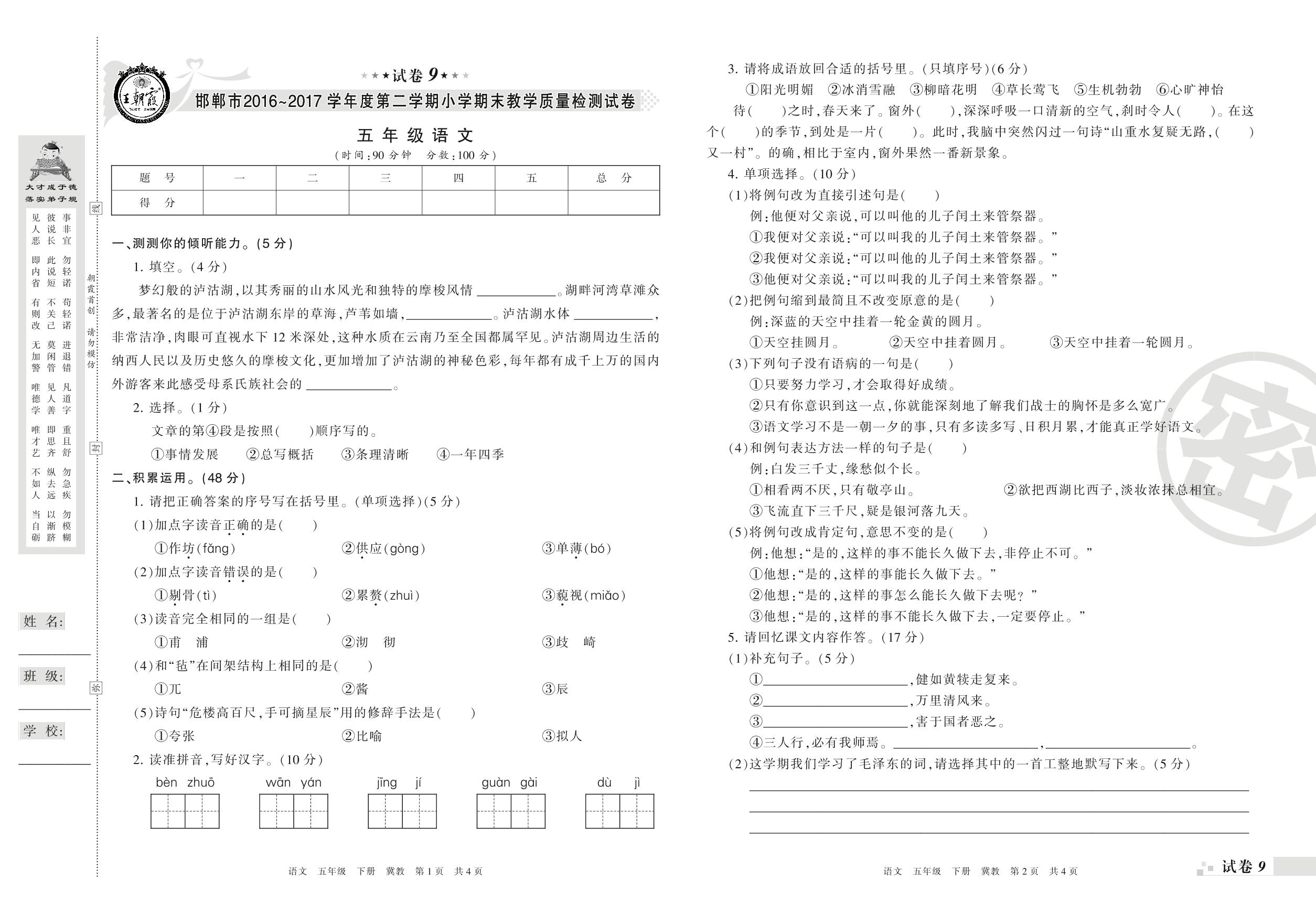 2016-2017学年第二学期邯郸市五年级语文试卷(冀教版)【9】
