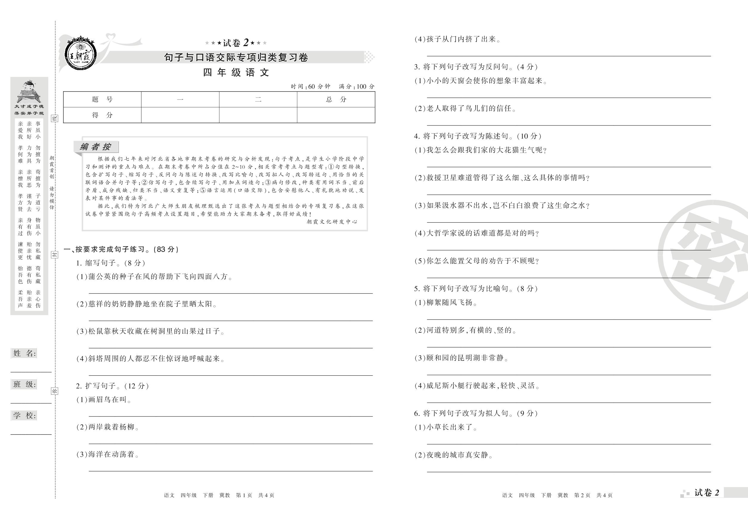 王朝霞期末专项卷——句子与口语交际专项归类复习卷四年级下册语文(冀教版)_R210801231006【2】