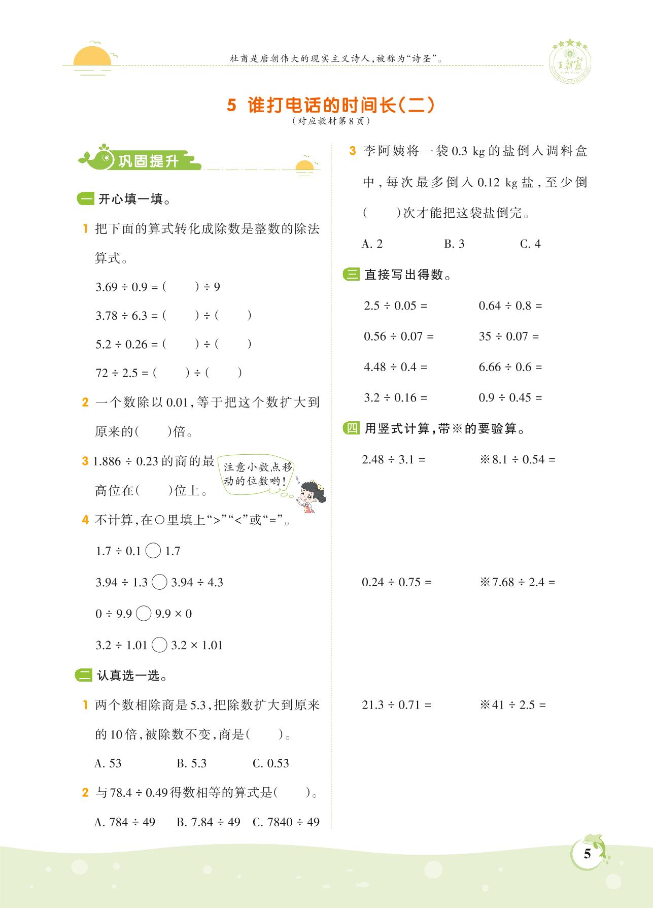 2021上册五年级数学北师版 第一单元 小数除法——5 谁打电话的时间长(二)