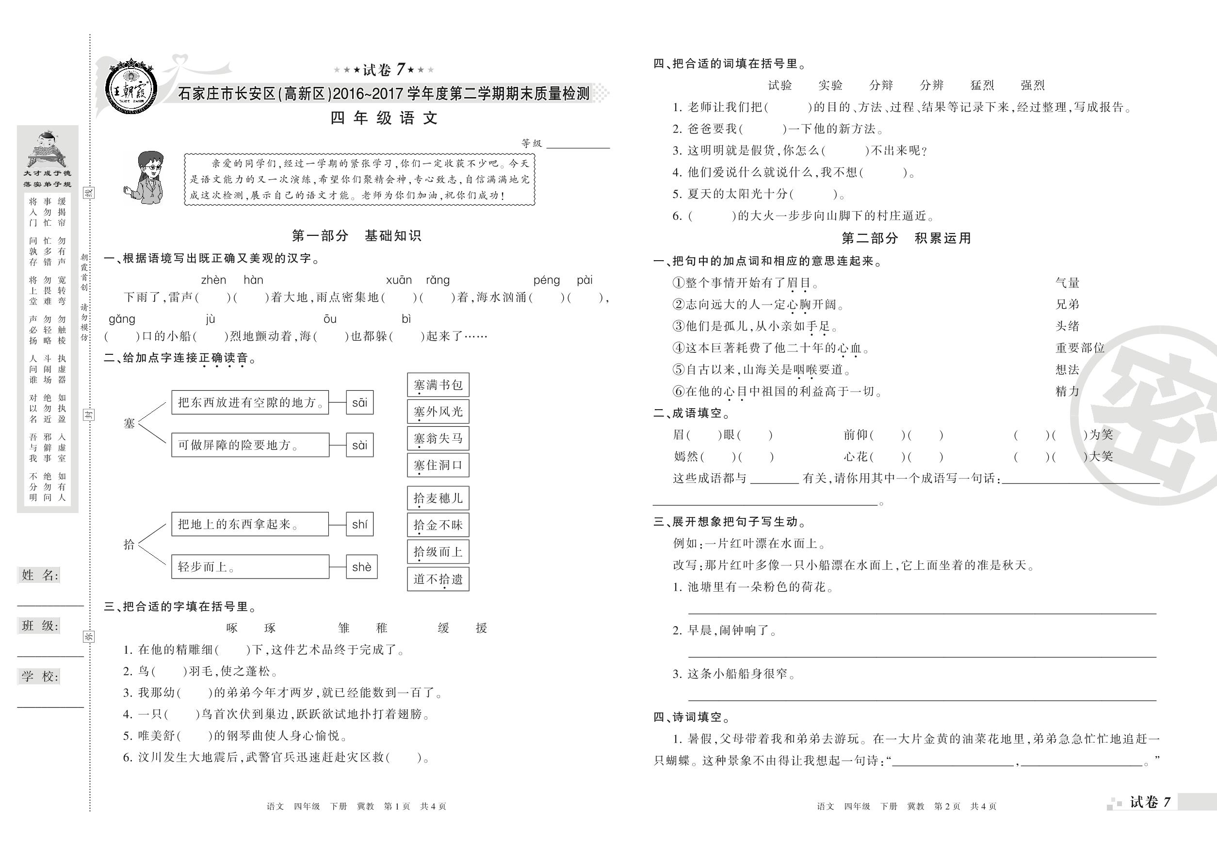 2016-2017学年第二学期石家庄市长安区(高新区)四年级语文试卷(冀教版)【7】