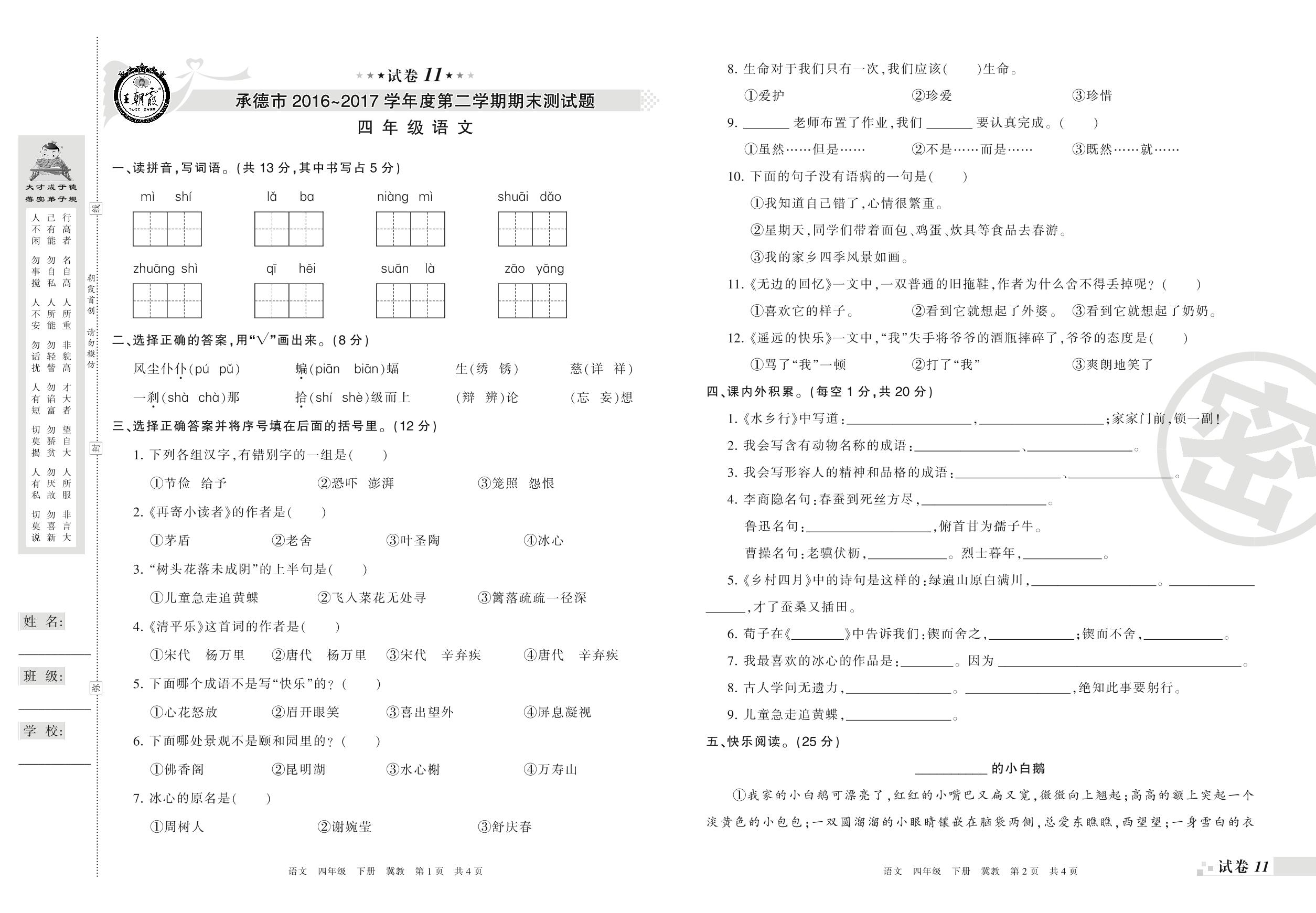 2016-2017学年第二学期承德市四年级语文试卷(冀教版)【11】