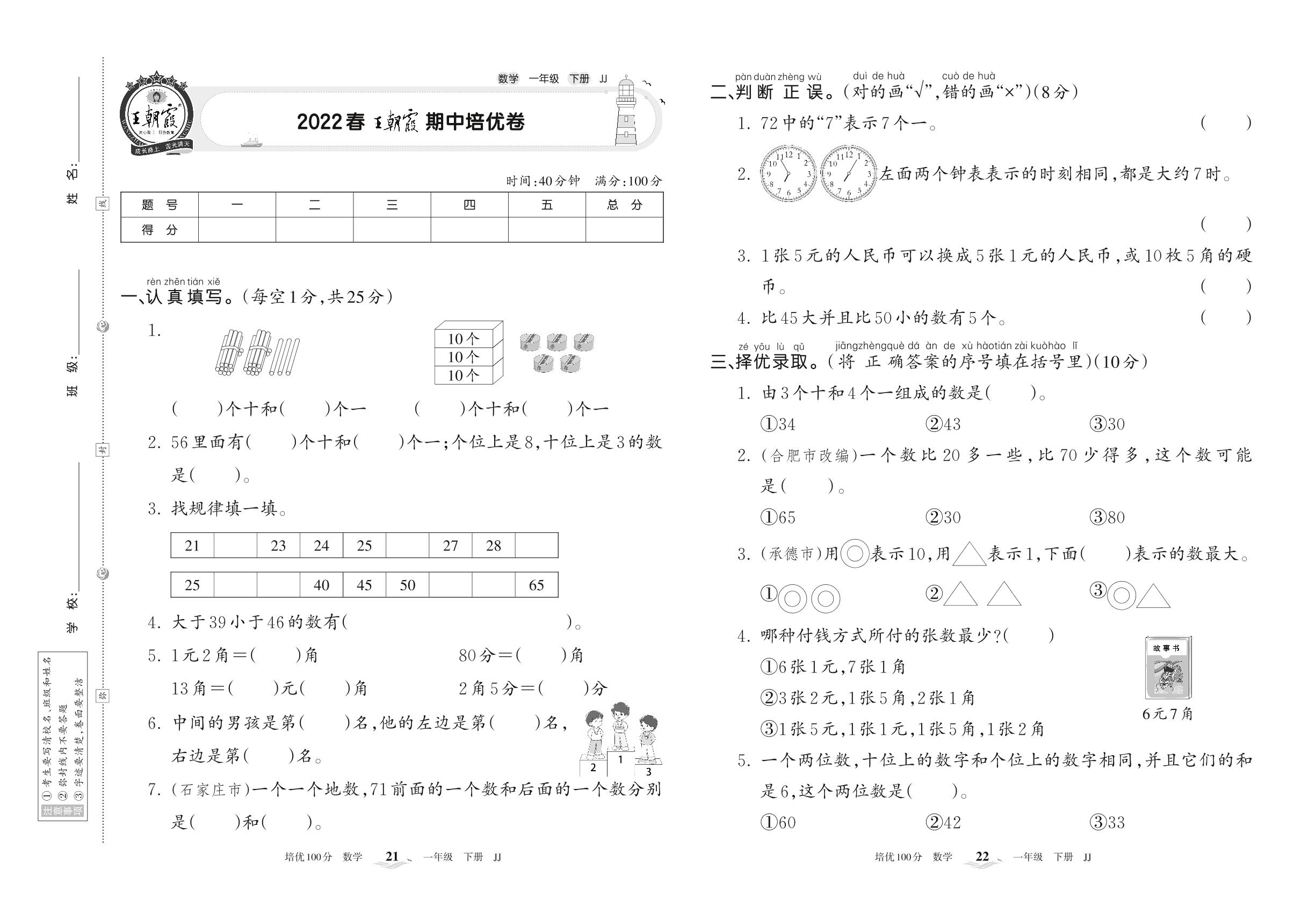 2022下册一年级数学冀教版 王朝霞期中培优卷
