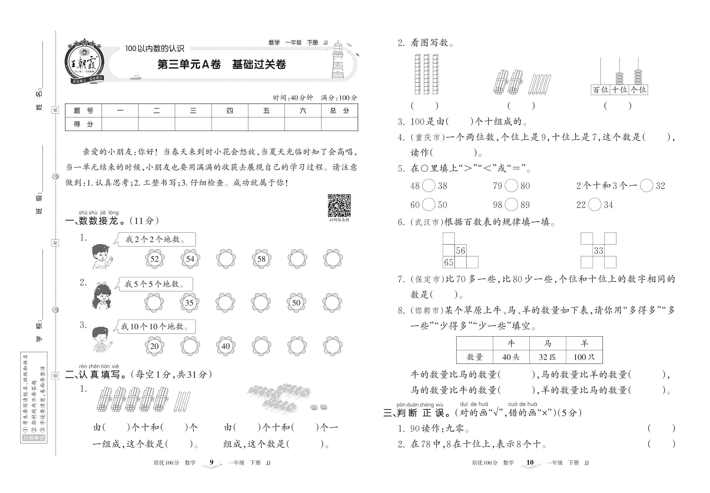 2022下册一年级数学冀教版 第三单元A卷 基础过关卷