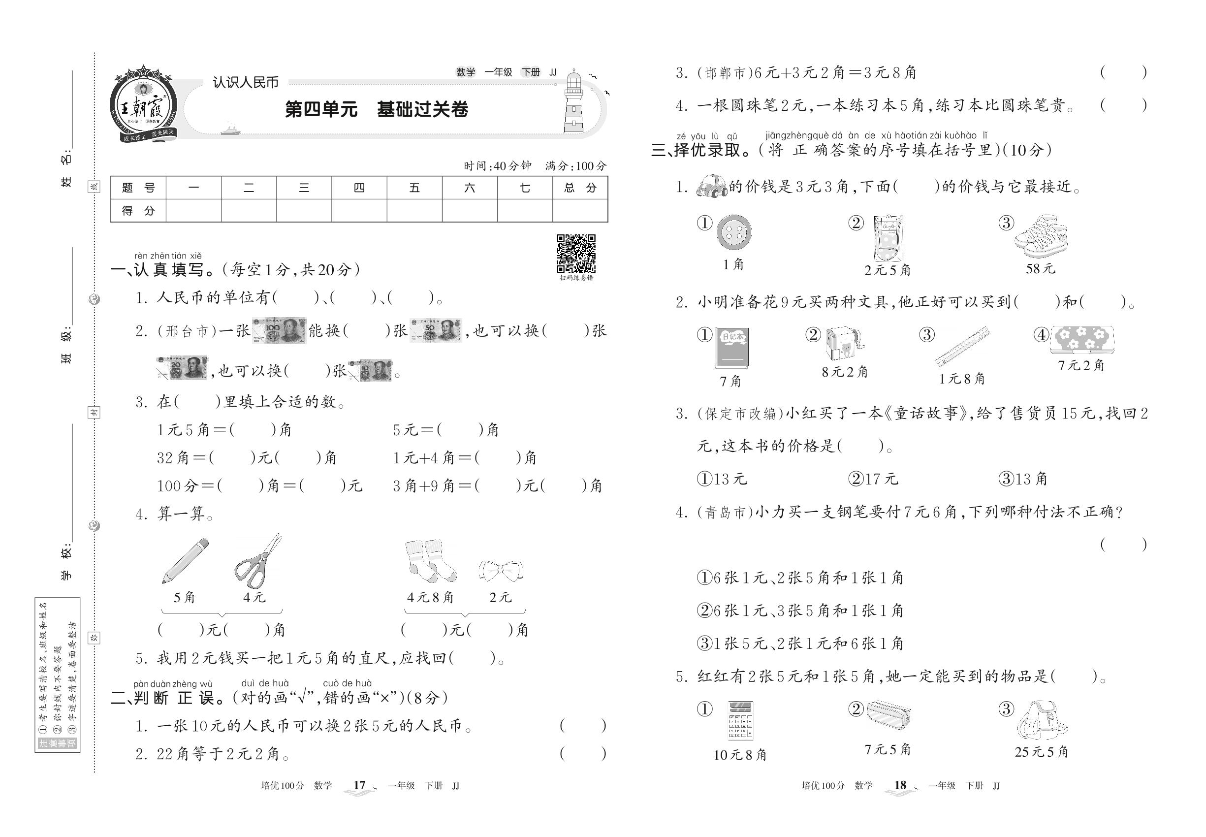 一年级数学冀教版下册单元卷