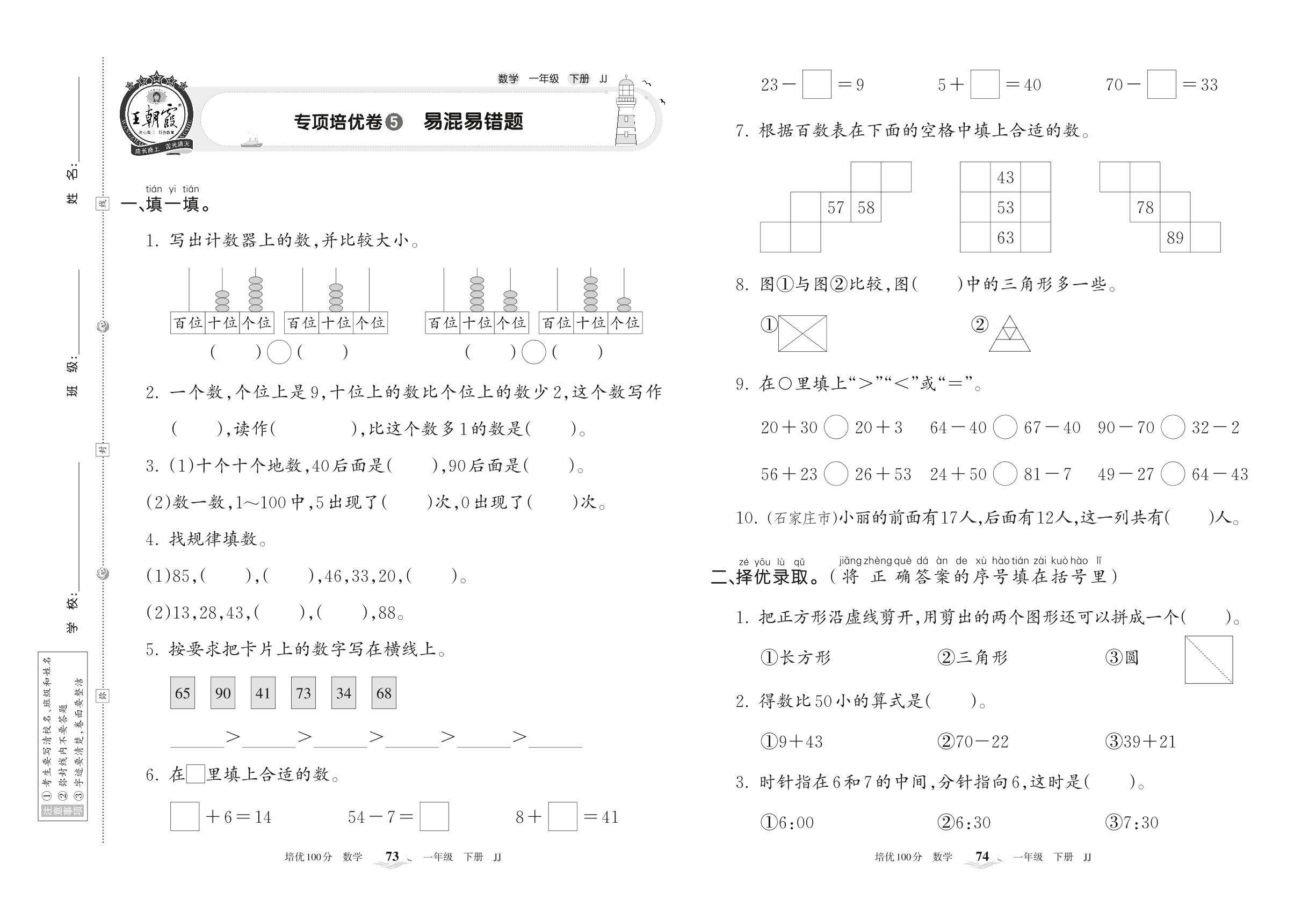 一年级数学冀教版下册专项卷