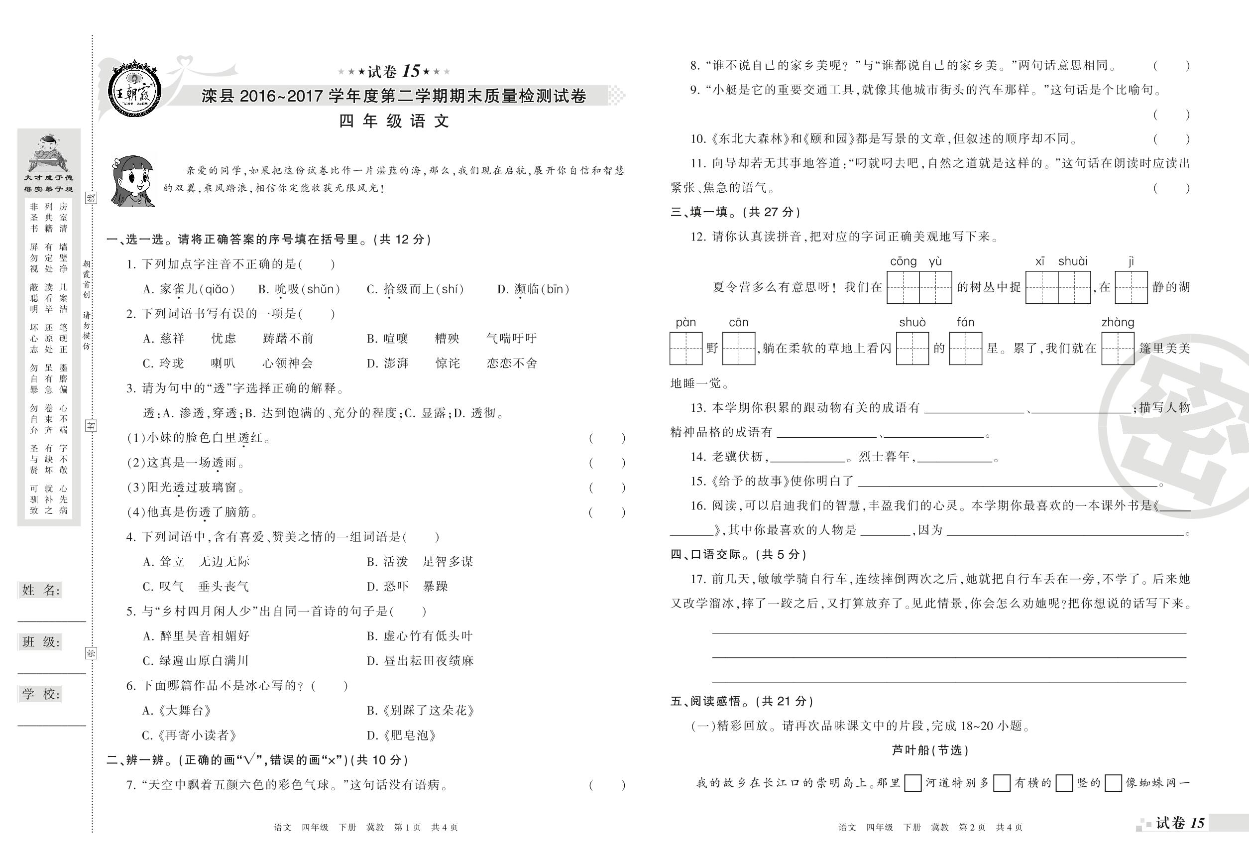 2016-2017学年第二学期唐山市滦县四年级语文试卷(冀教版)【15】