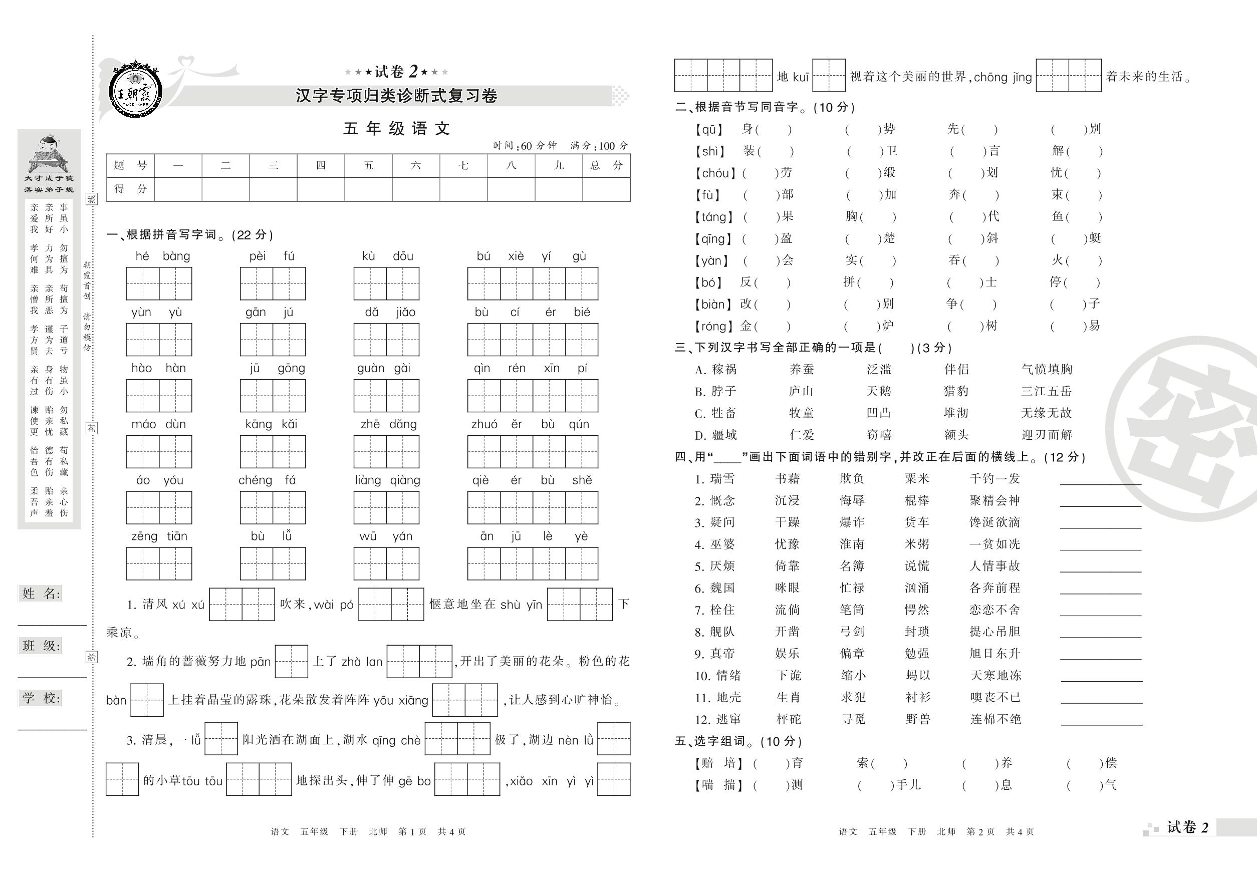 王朝霞期末专项卷——汉字专项归类诊断式复习卷五年级下册语文(北师版)_R210801231053【2】
