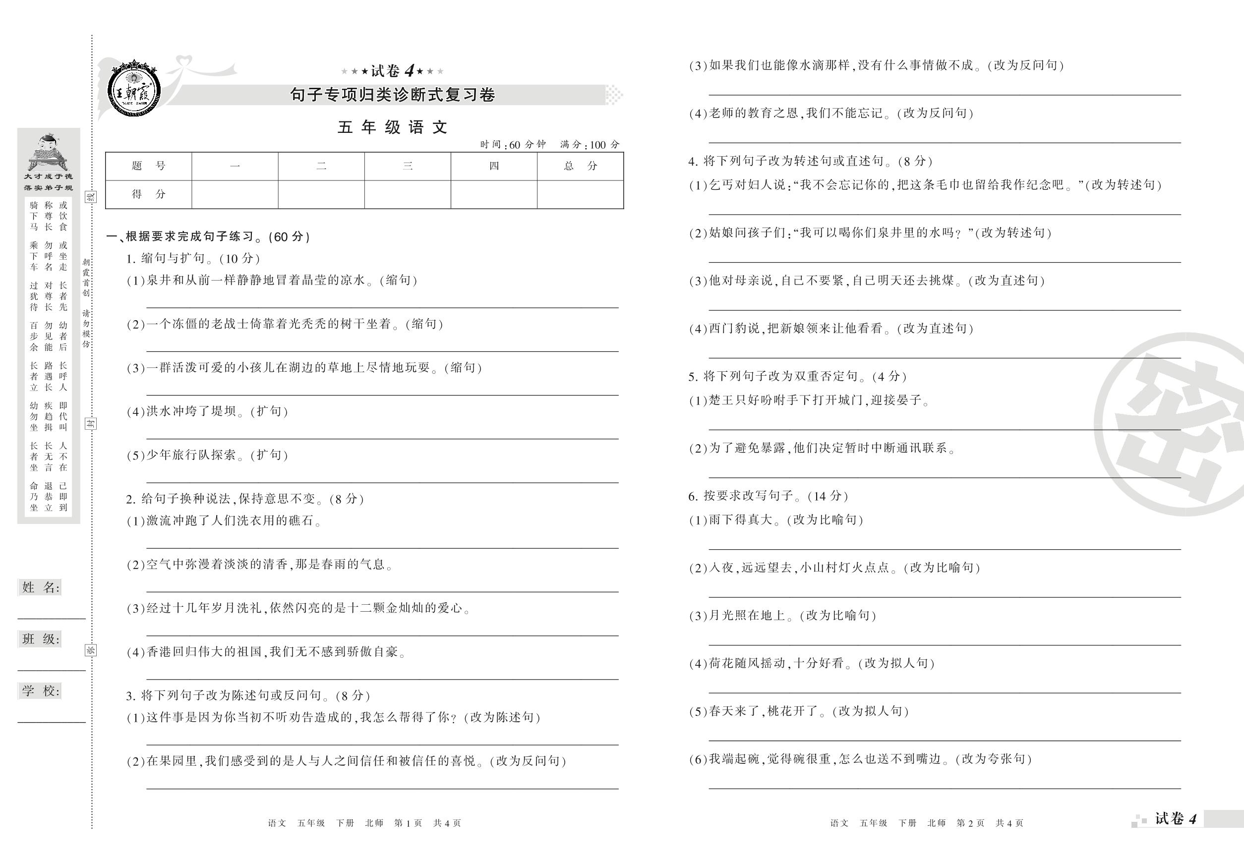 王朝霞期末专项卷——句子专项归类诊断式复习卷五年级下册语文(北师版)_R210801231105【4】