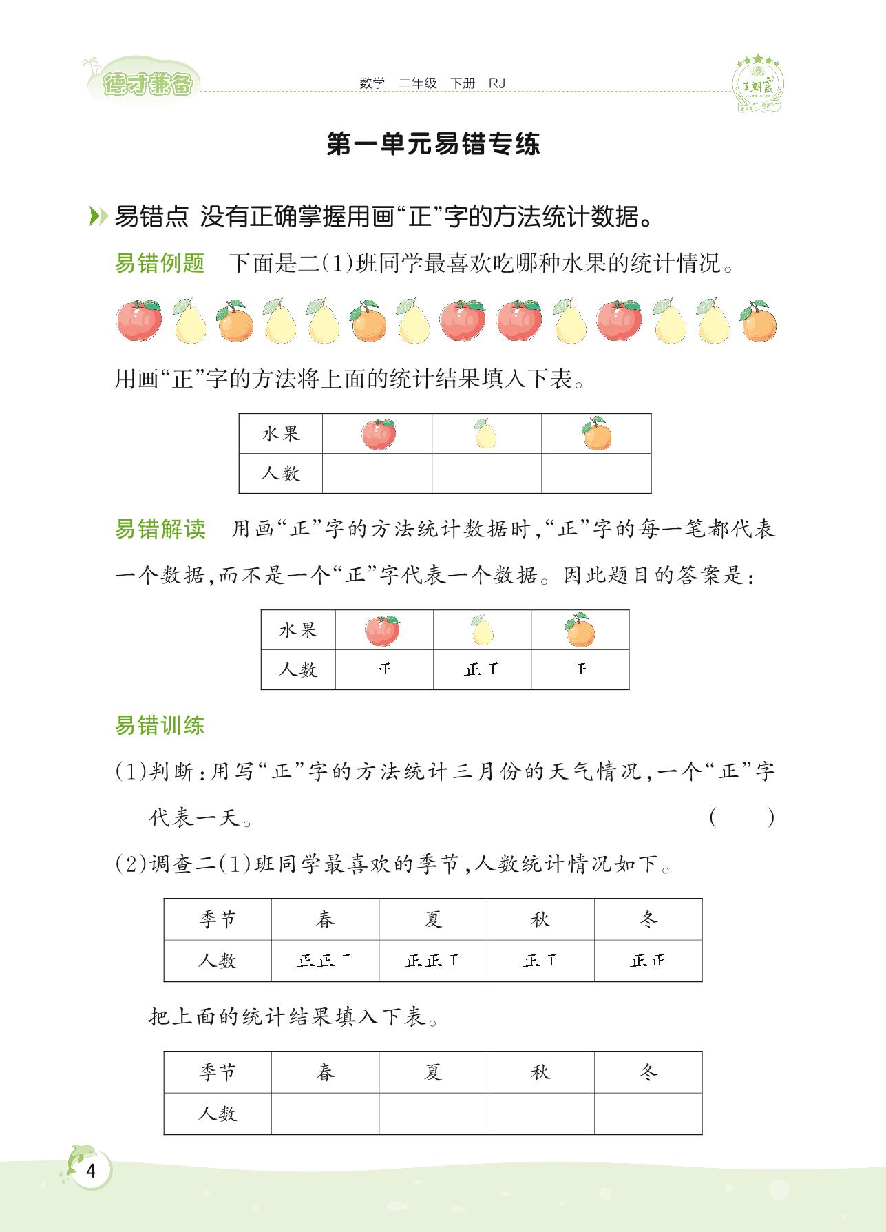 2022下册二年级数学人教版 第一单元 数据收集整理——第一单元易错专练