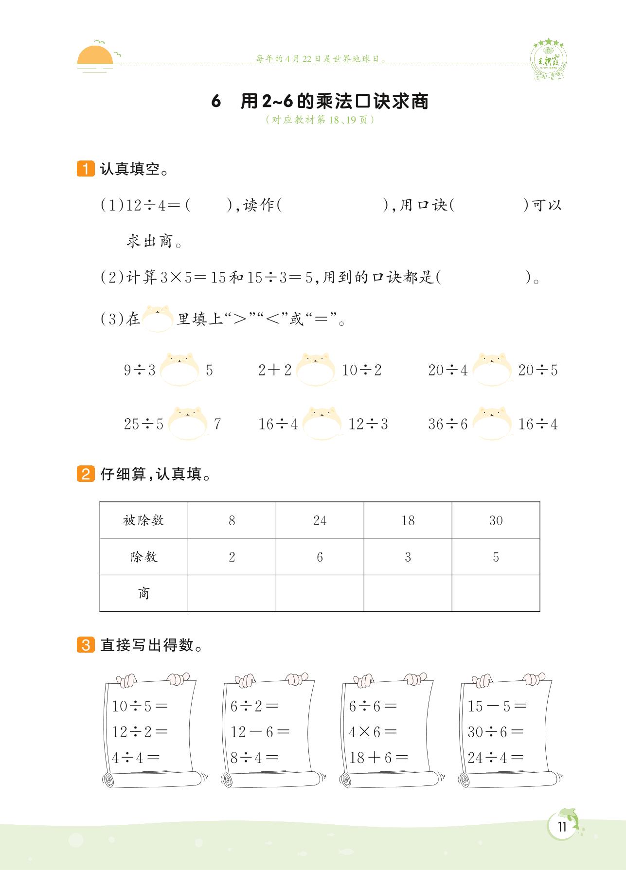 2022下册二年级数学人教版 第二单元 表内除法(一)——6 用2~6的乘法口诀求商