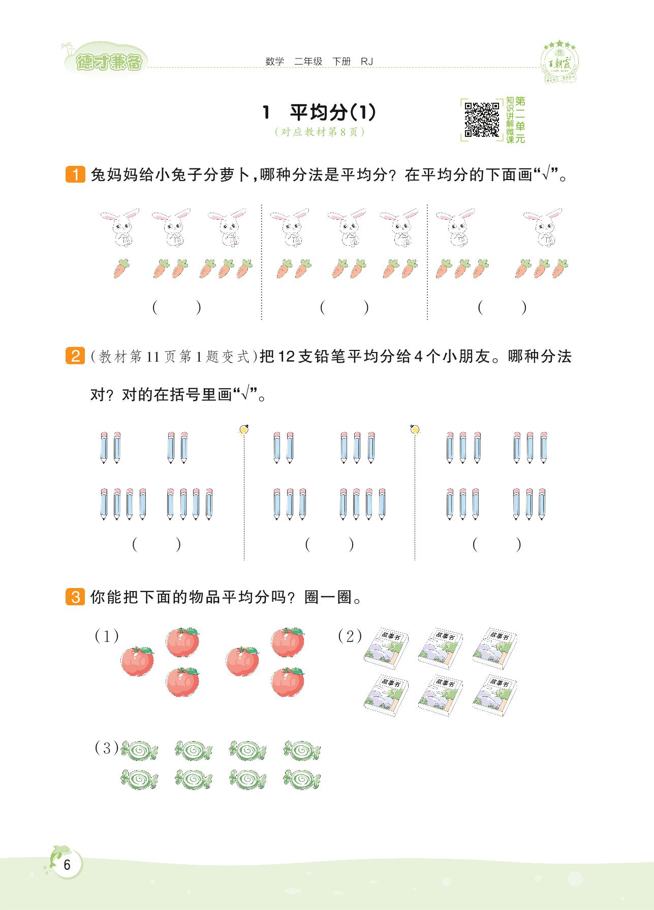 2022下册二年级数学人教版 第二单元 表内除法(一)——1 平均分(1)