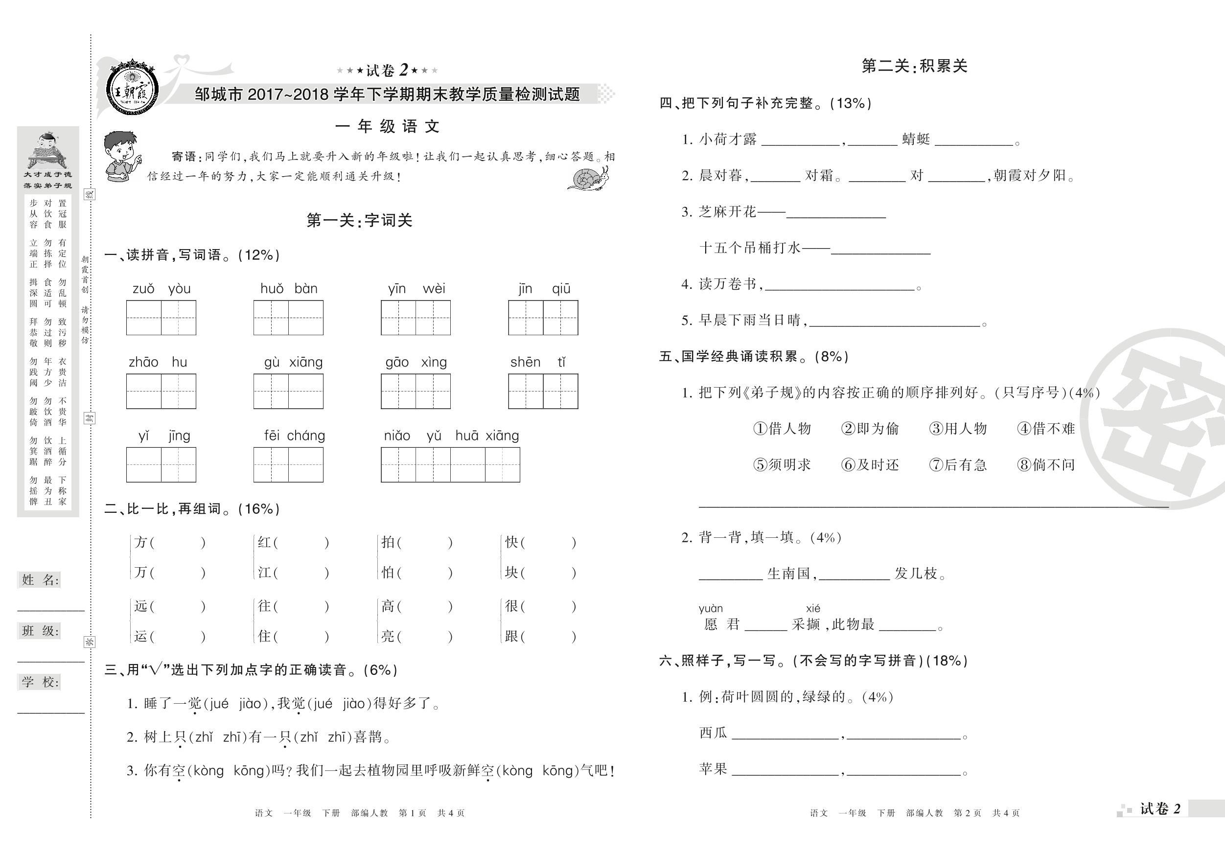 2017-2018学年第二学期邹城市一年级语文试卷(人教版)【2】