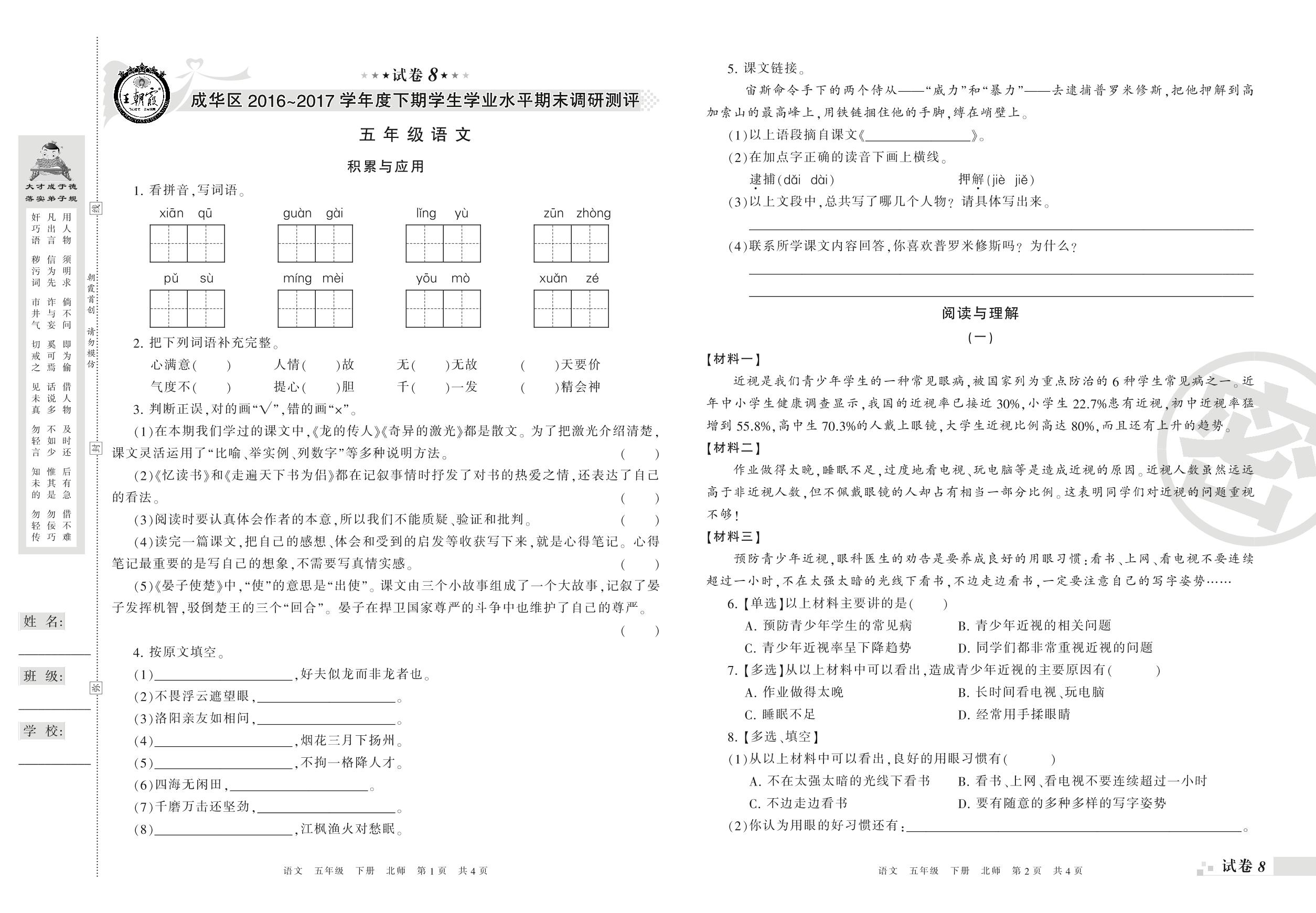 2016-2017学年第二学期成都市成华区五年级语文试卷(北师版)【8】