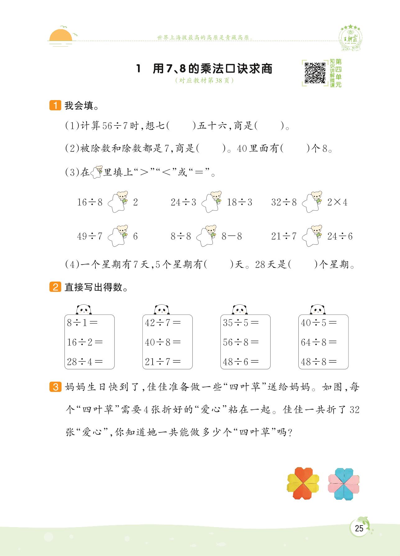 2022下册二年级数学人教版 第四单元 表内除法(二)——1 用7、8的乘法口诀求商