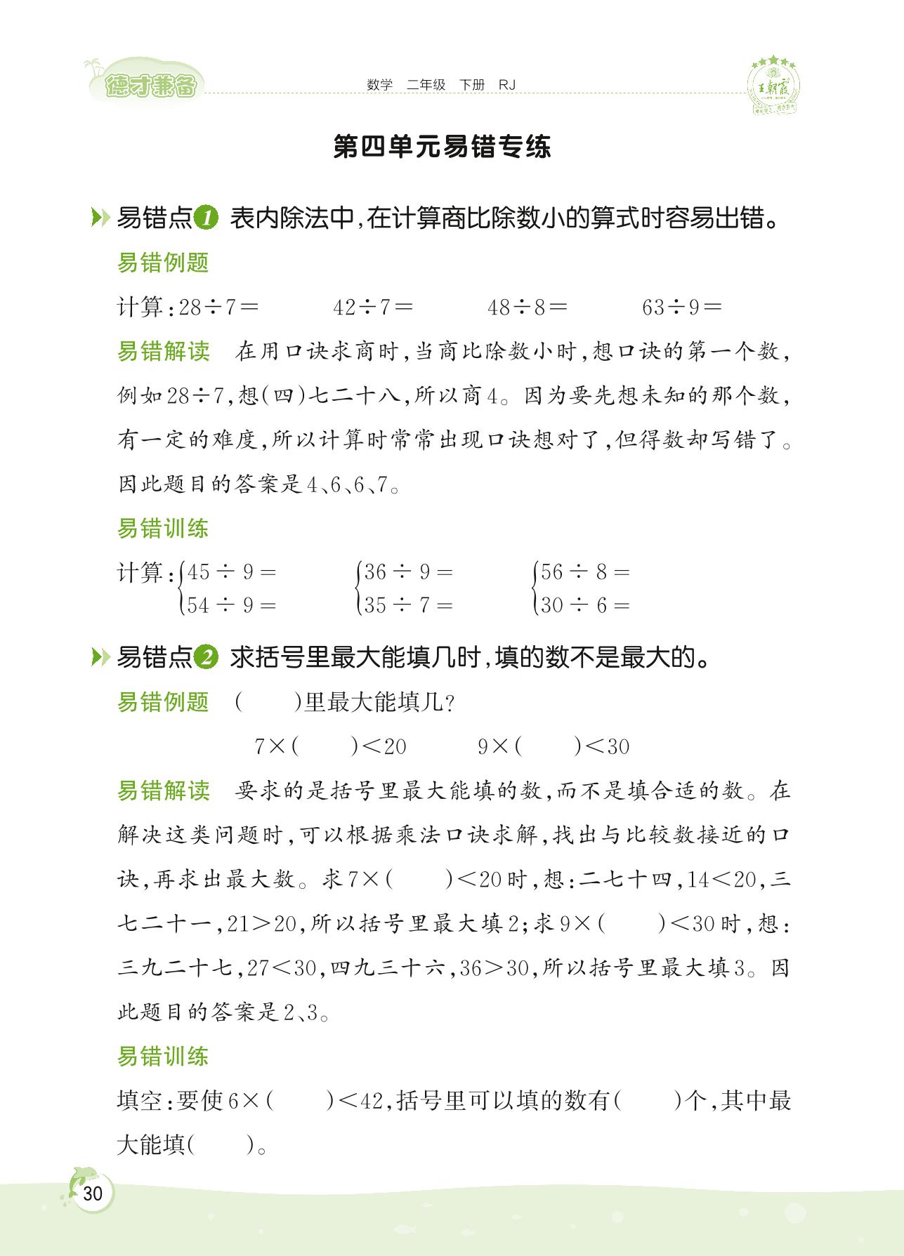 2022下册二年级数学人教版 第四单元 表内除法(二)——第四单元易错专练