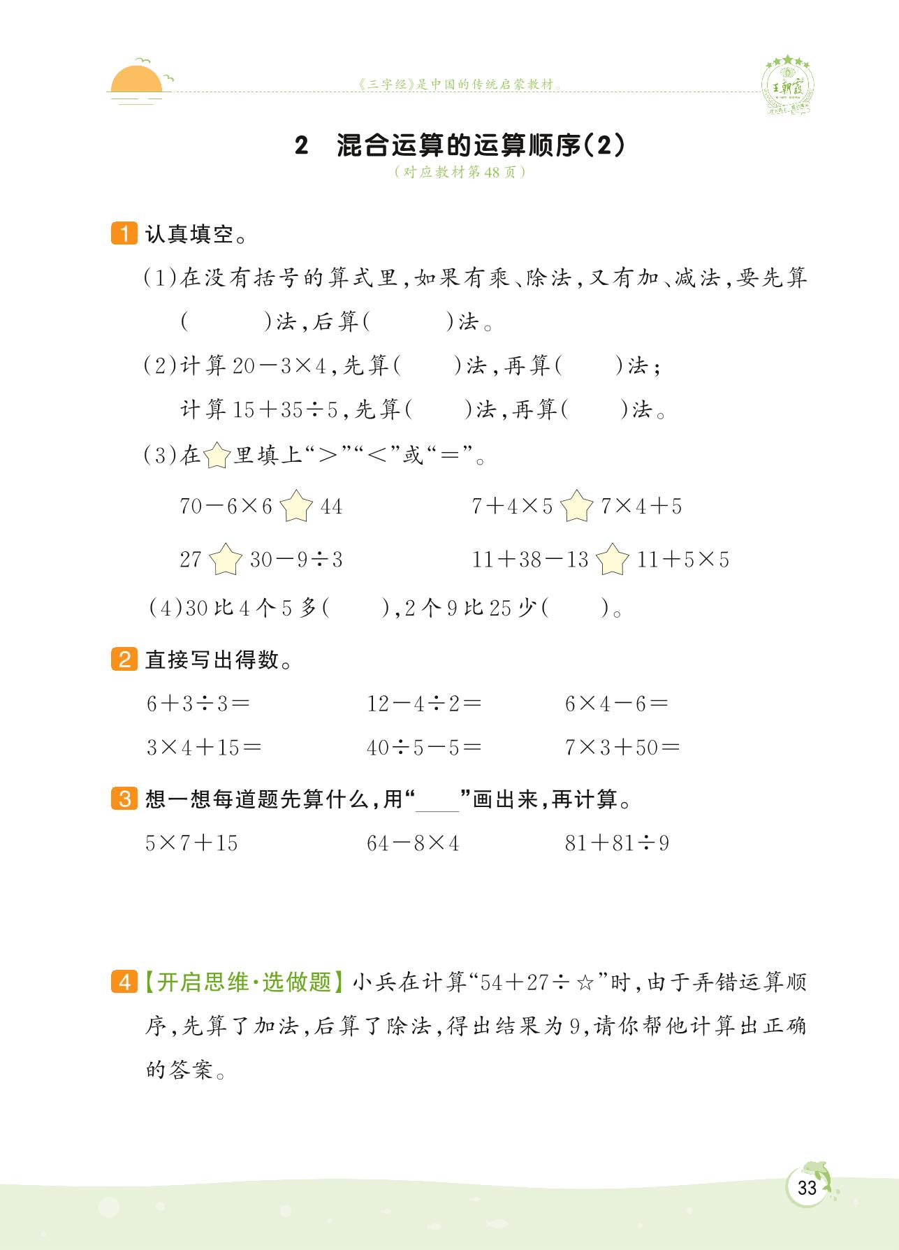 2022下册二年级数学人教版 第五单元 混合运算——2 混合运算的运算顺序(2)