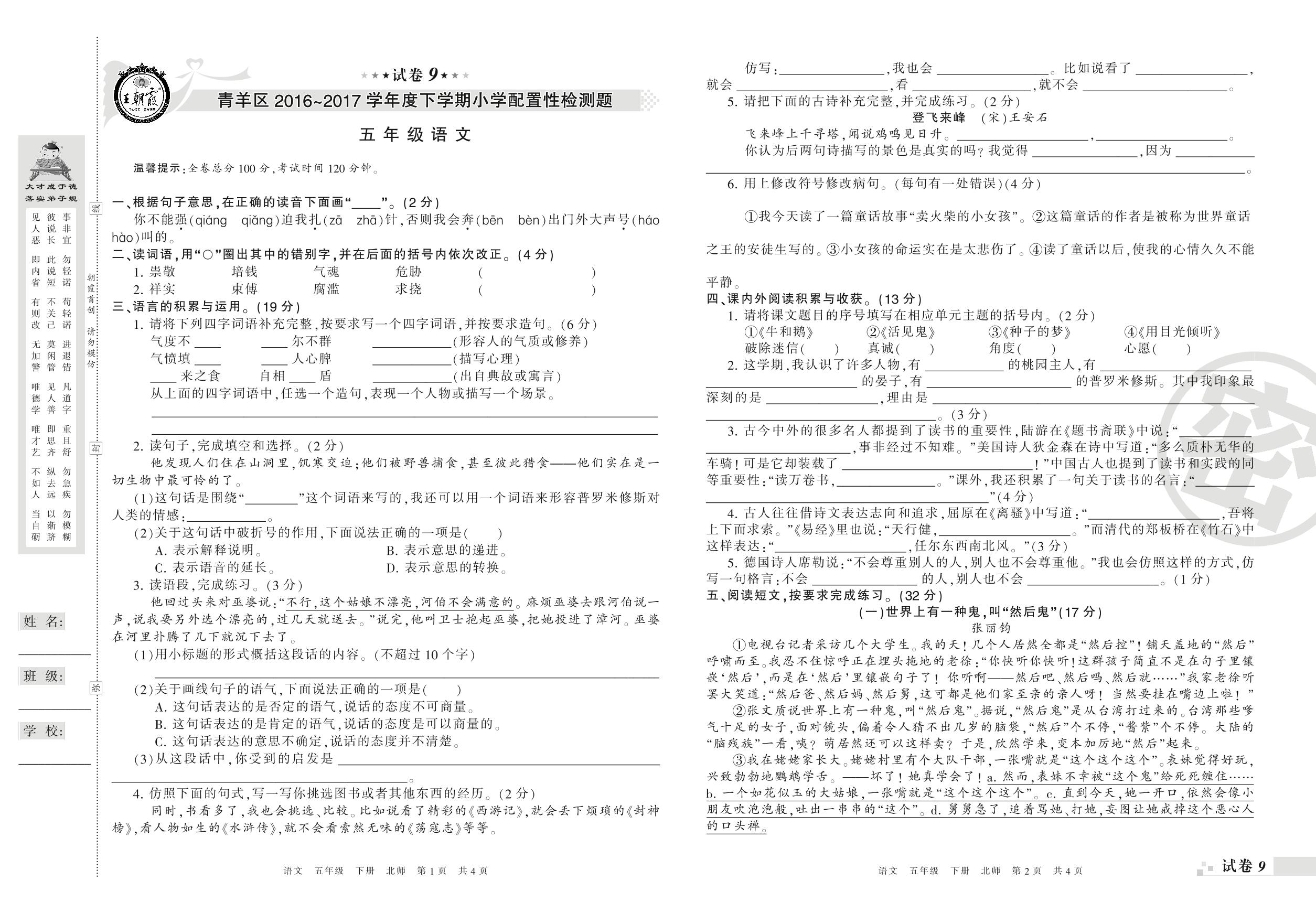 2016-2017学年第二学期成都市青羊区五年级语文试卷(北师版)【9】