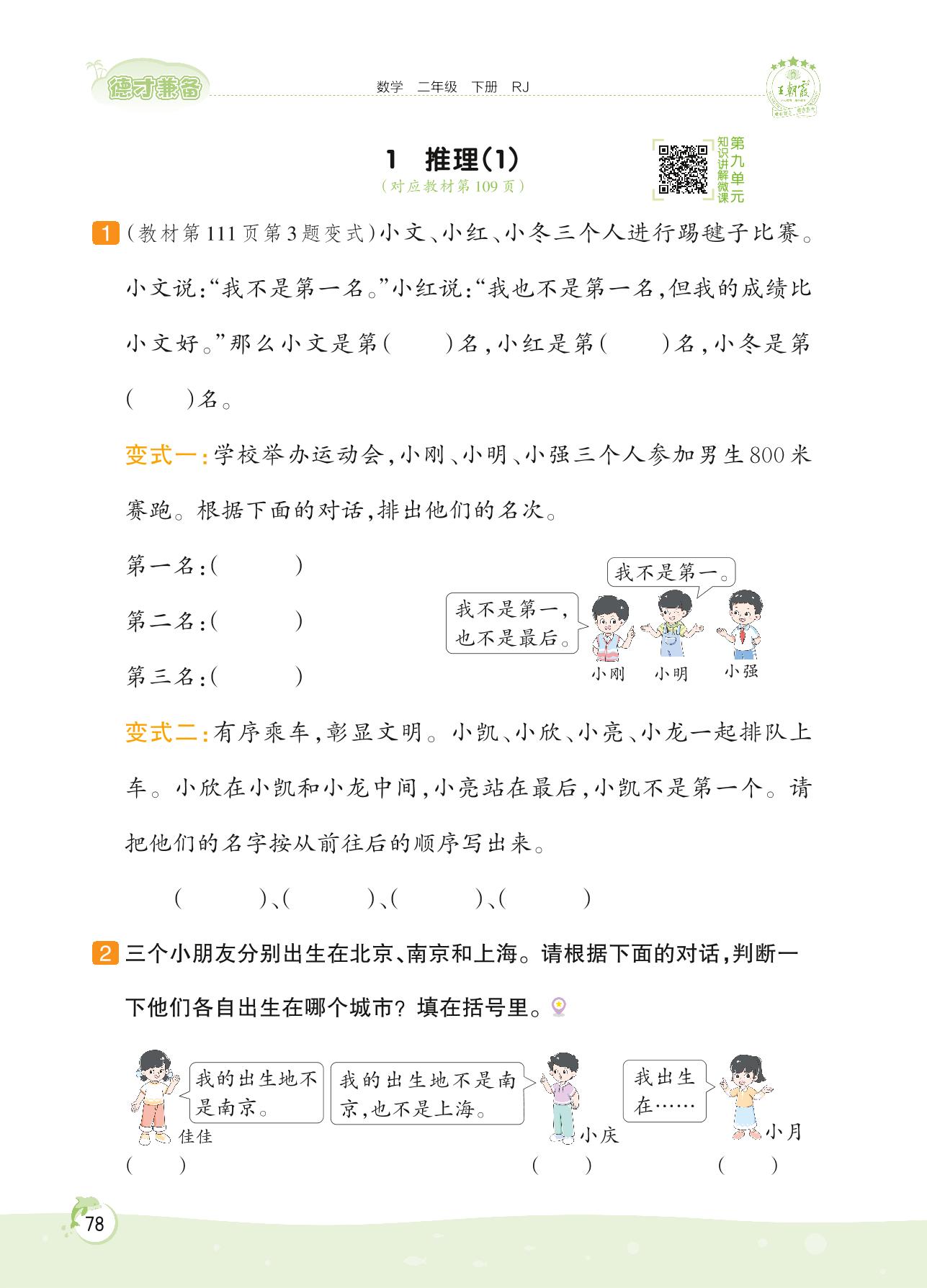 2022下册二年级数学人教版 第九单元 数学广角——推理——1 推理(1)