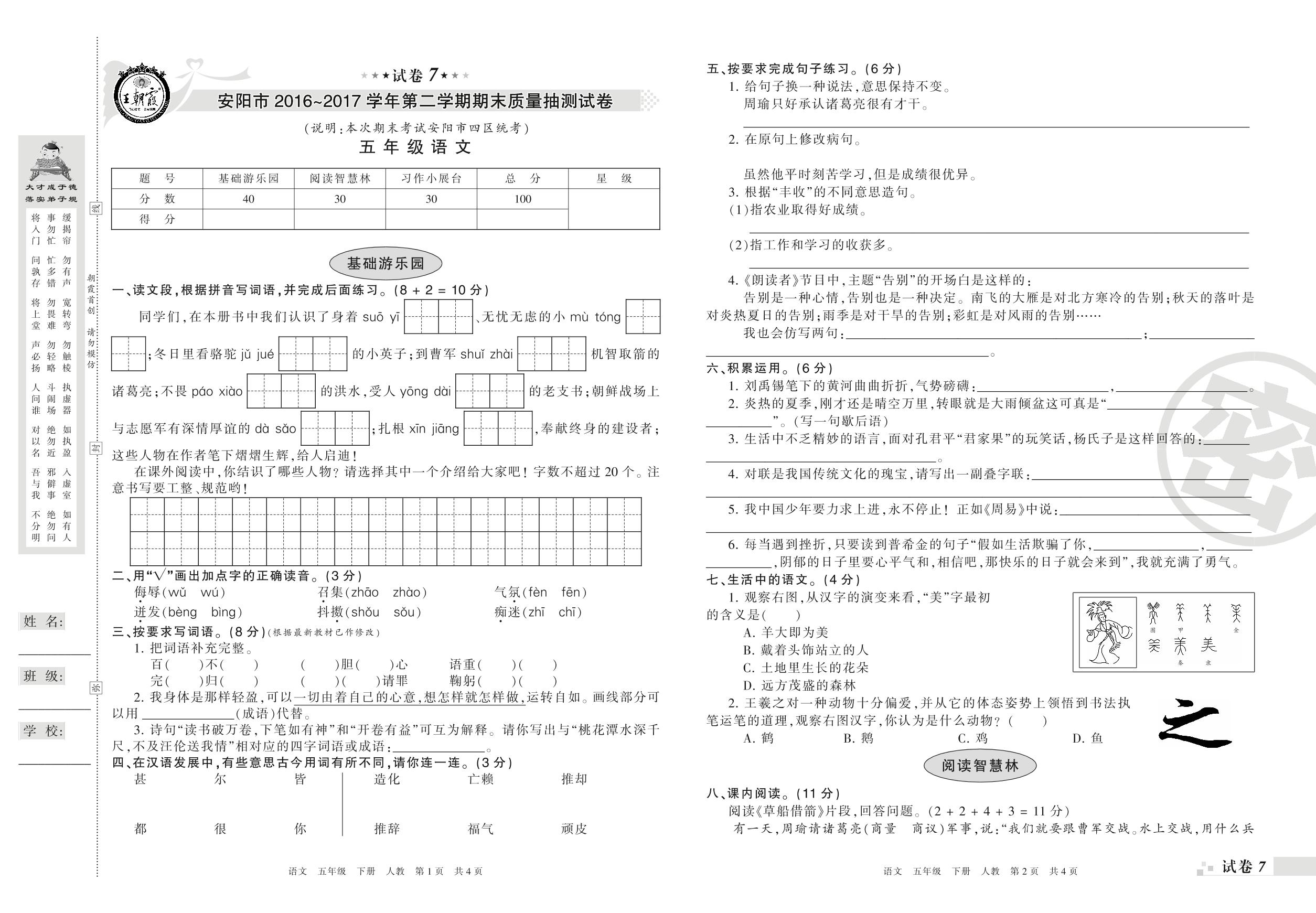 2016-2017学年第二学期安阳市五年级语文试卷(人教版)【7】