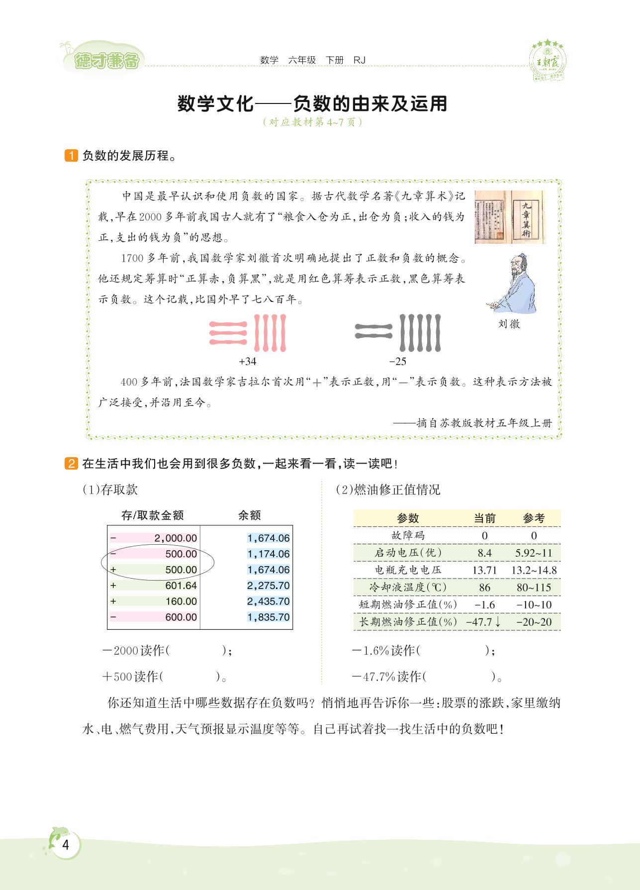 2022下册六年级数学人教版 第一单元 负数——数学文化 负数的由来及运用