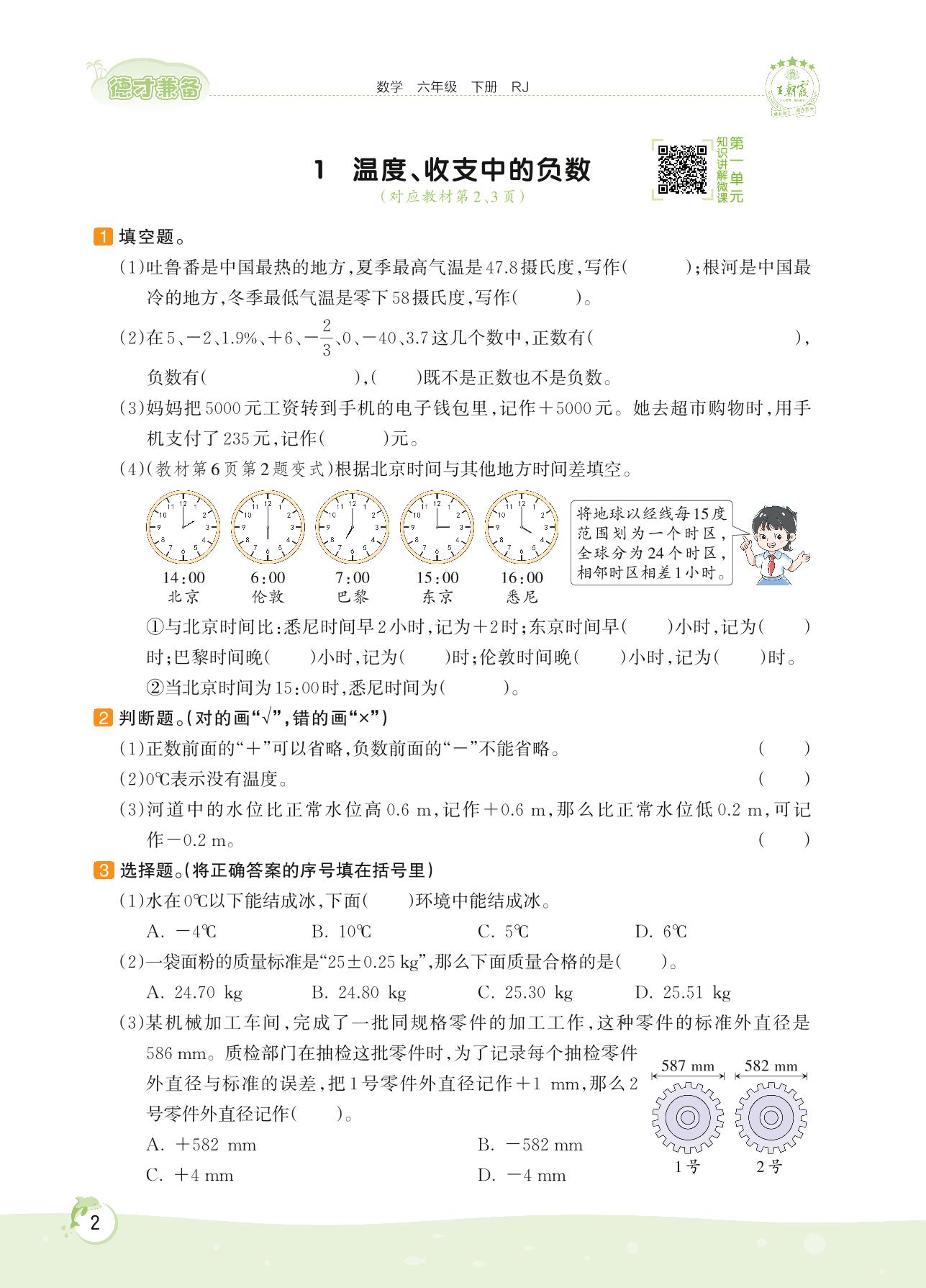 2022下册六年级数学人教版 第一单元 负数——1 温度、收支中的负数
