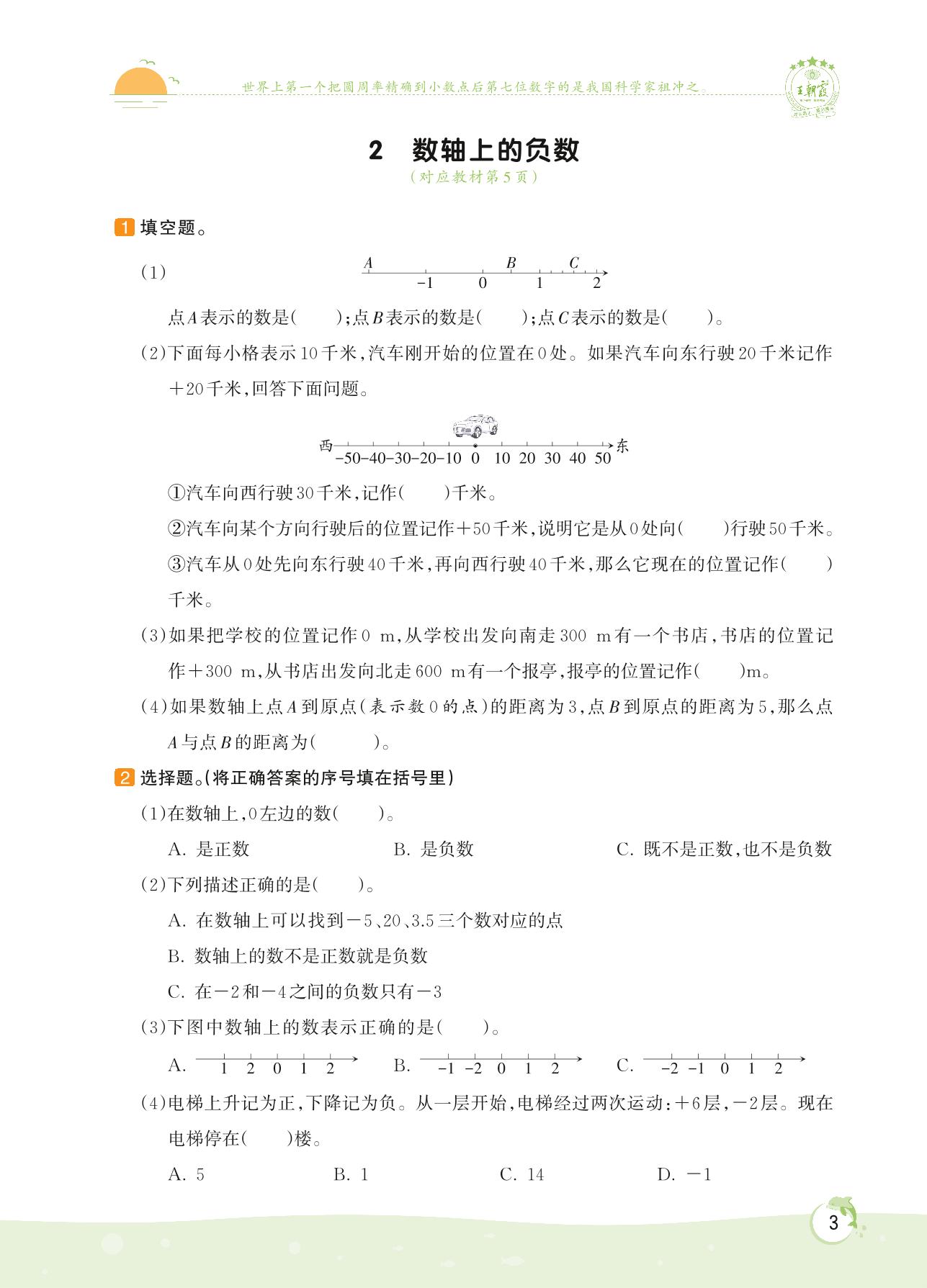 2022下册六年级数学人教版 第一单元 负数——2 数轴上的负数