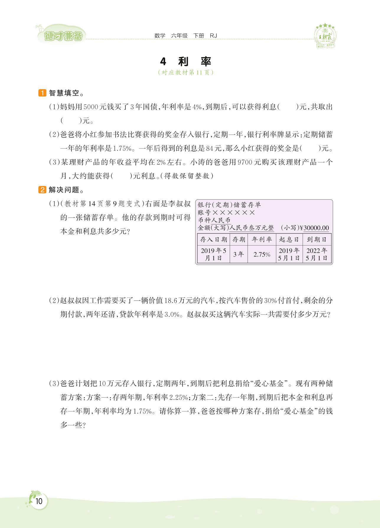 2022下册六年级数学人教版 第二单元 百分数(二)——4 利率