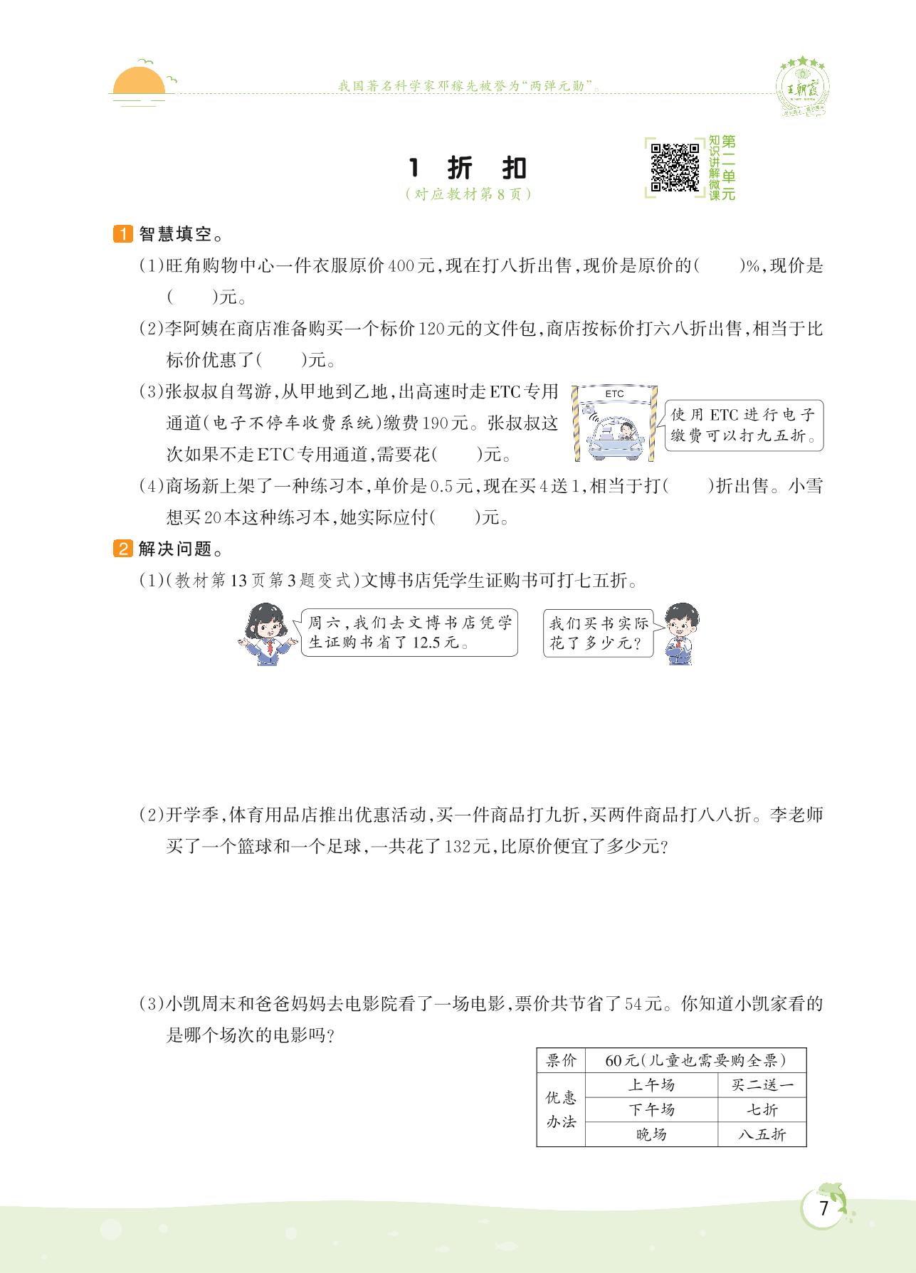 2022下册六年级数学人教版 第二单元 百分数(二)——1 折扣