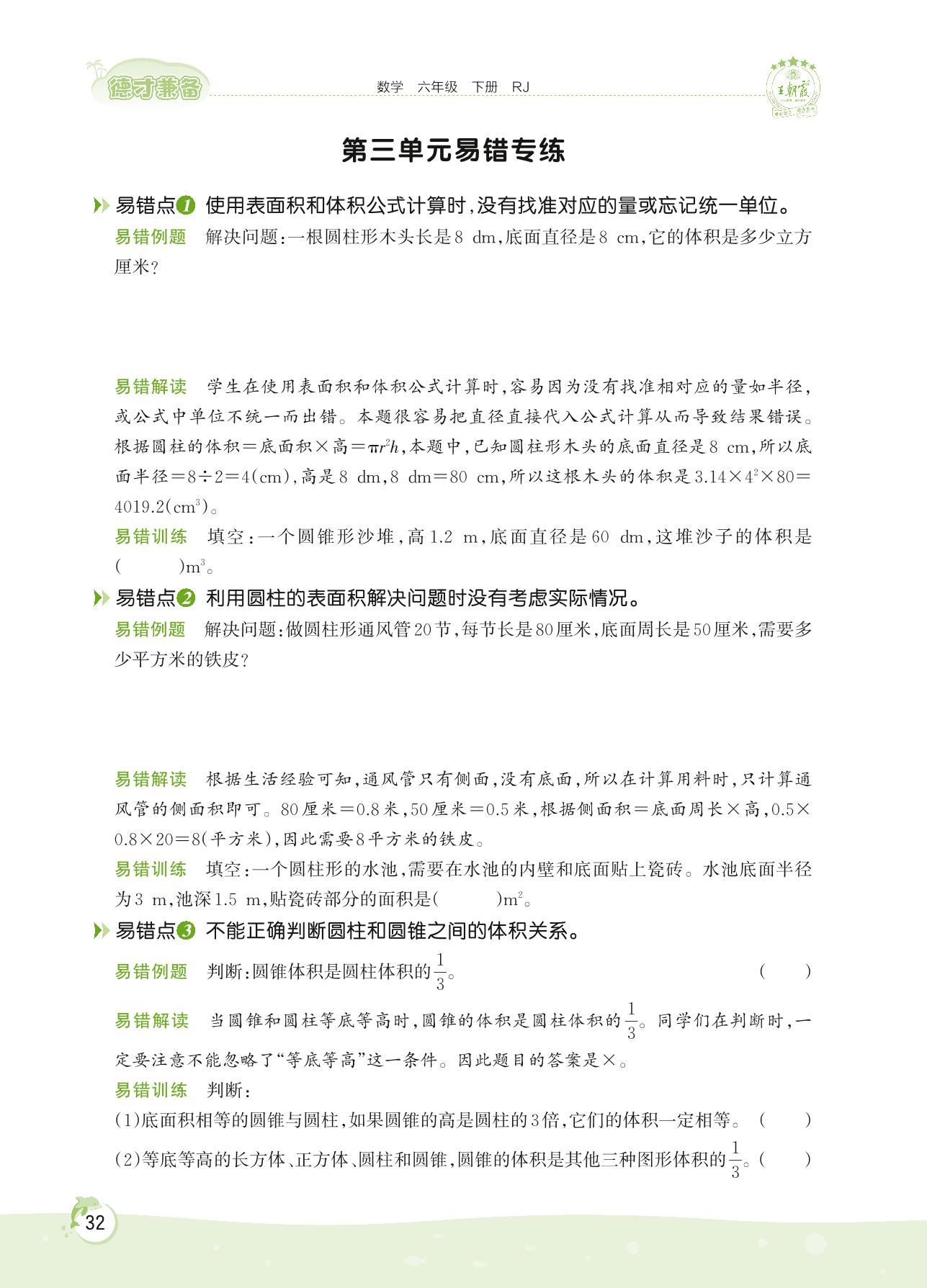 2022下册六年级数学人教版 第三单元 圆柱与圆锥——第三单元易错专练