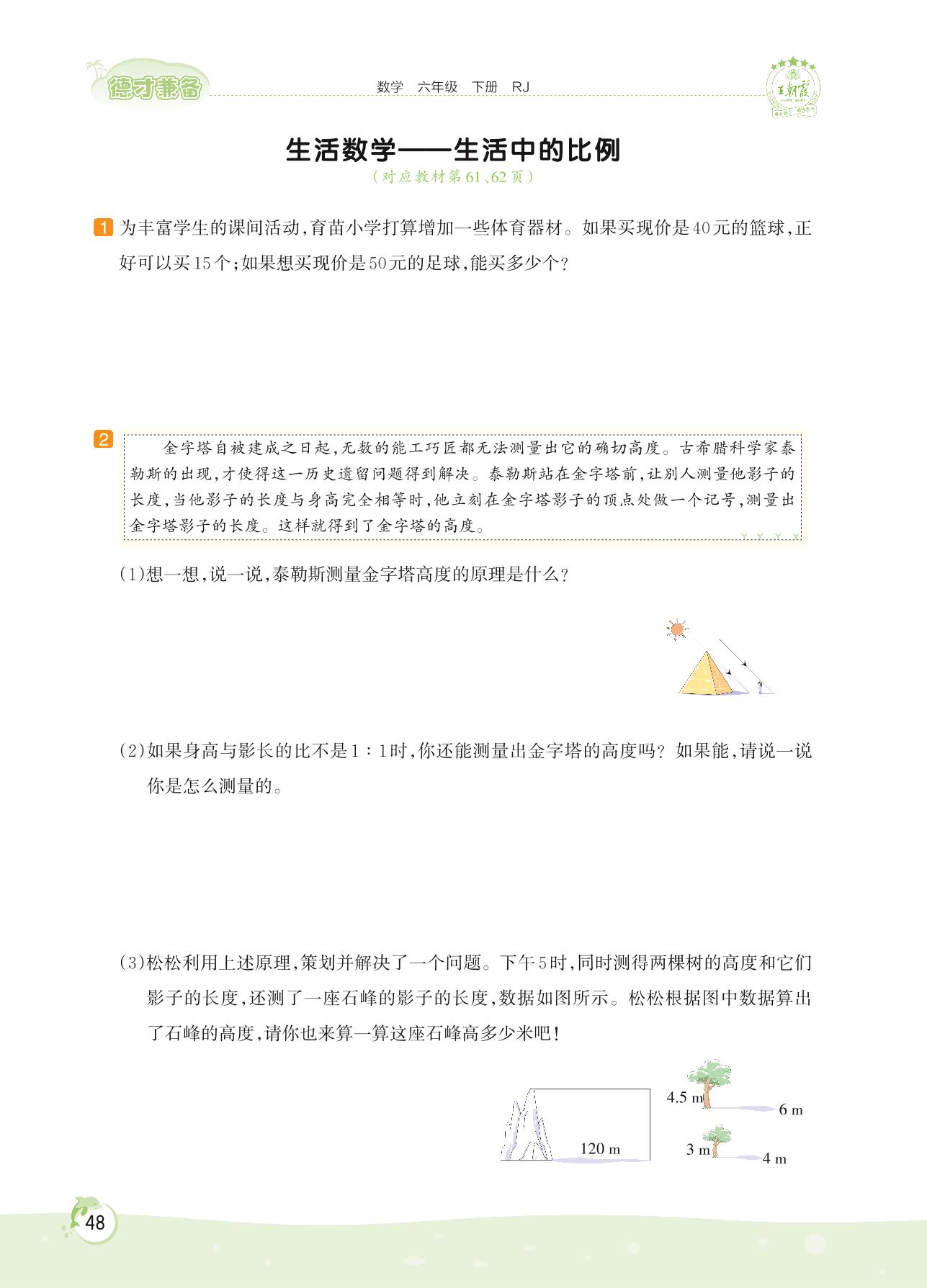 2022下册六年级数学人教版 第四单元 比例——生活数学 生活中的比例