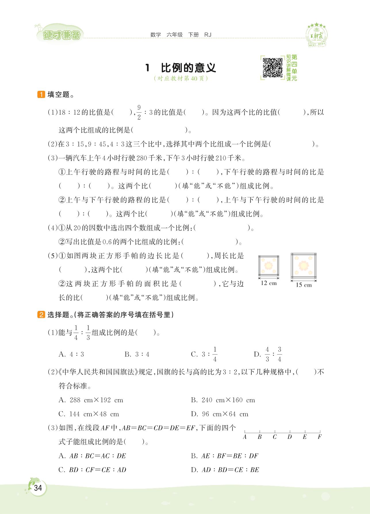 2022下册六年级数学人教版 第四单元 比例——1 比例的意义