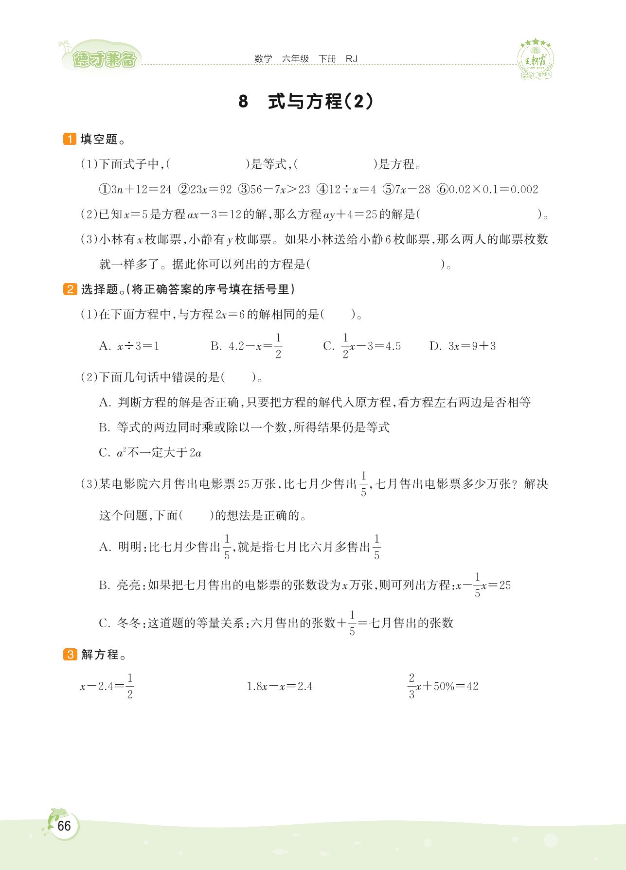 2022下册六年级数学人教版 第六单元 整理与复习——8 式与方程(2)
