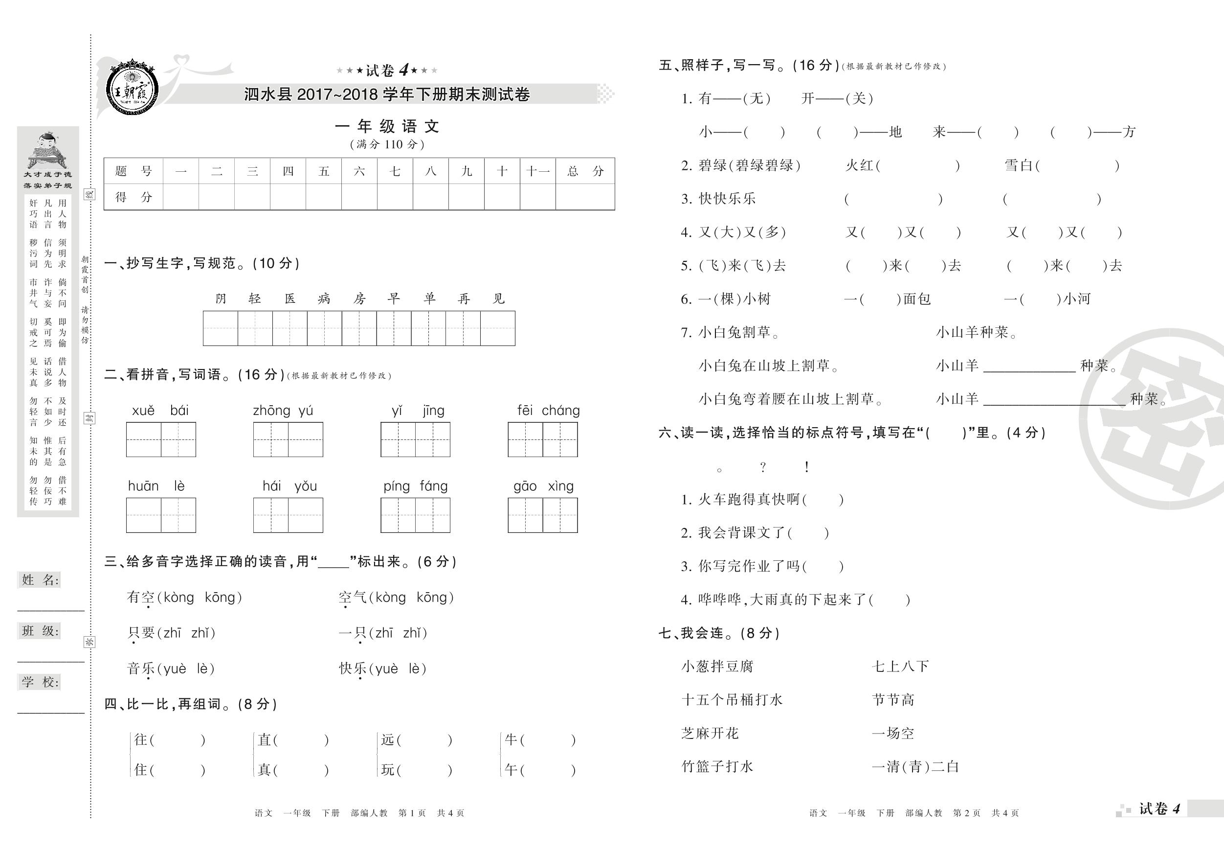 2017-2018学年第二学期济宁市泗水县一年级语文试卷(人教版)【4】