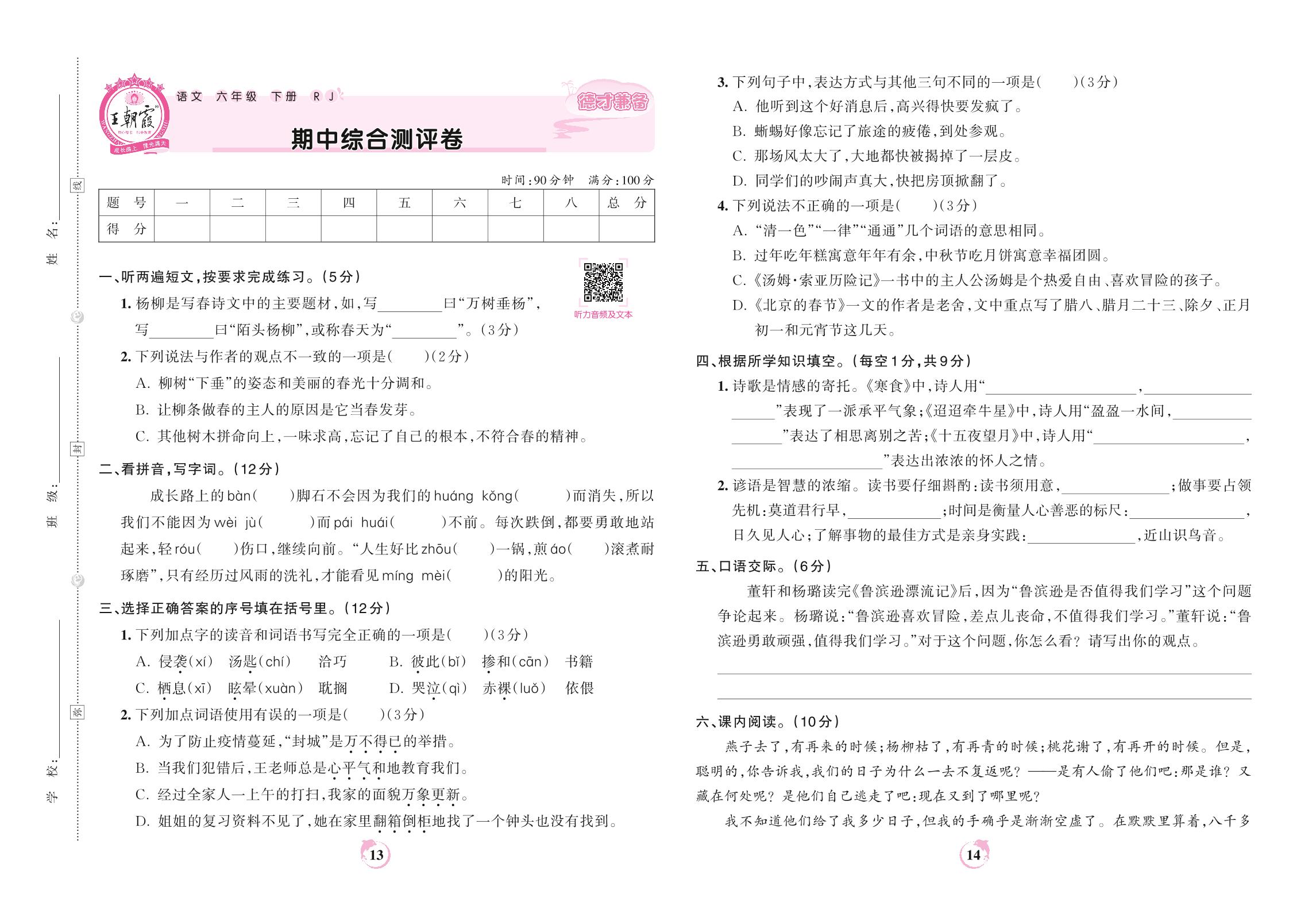 六年级语文人教版下册期中卷
