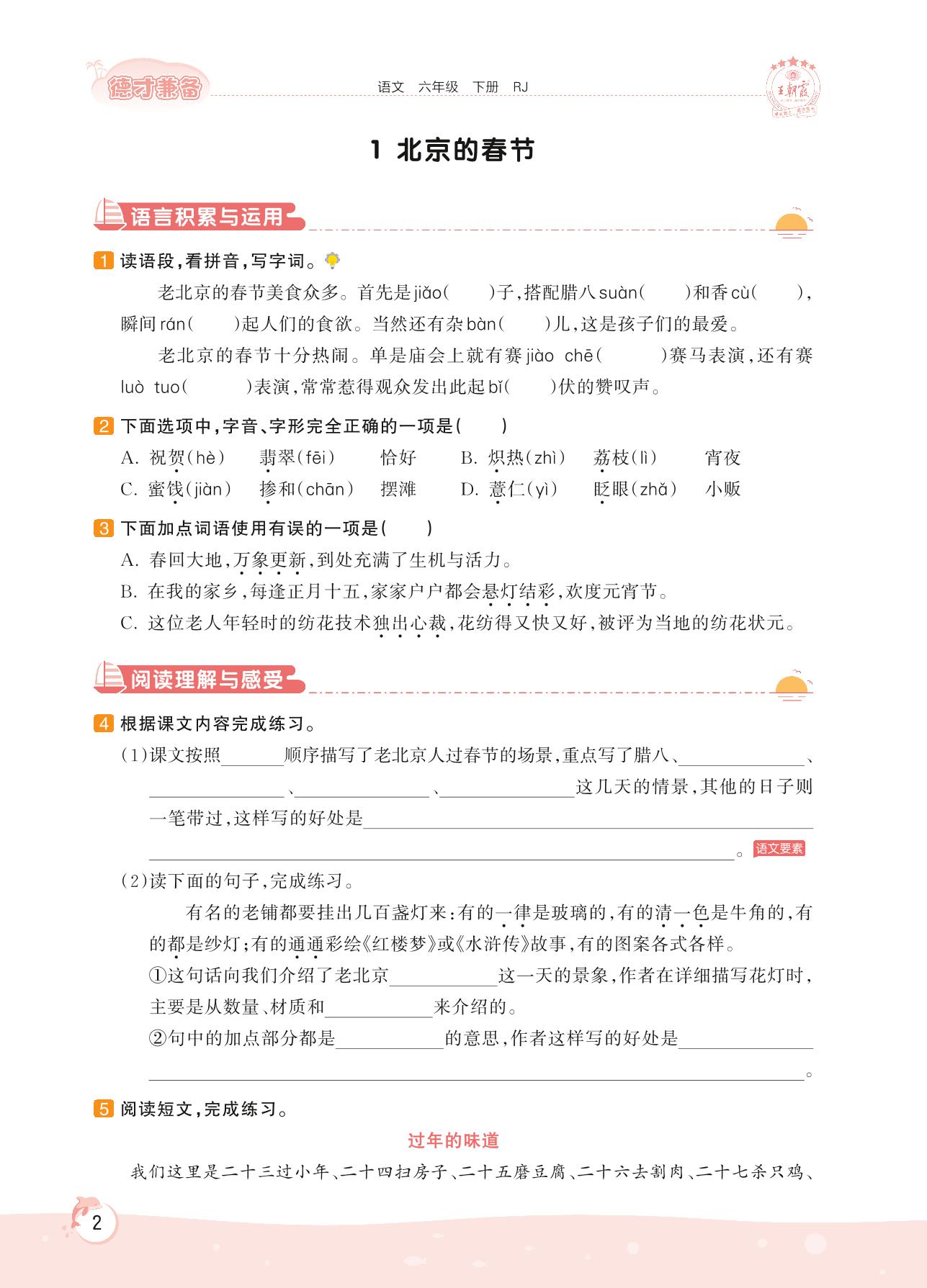 2022下册六年级语文人教版 第一单元 民风民俗——1 北京的春节