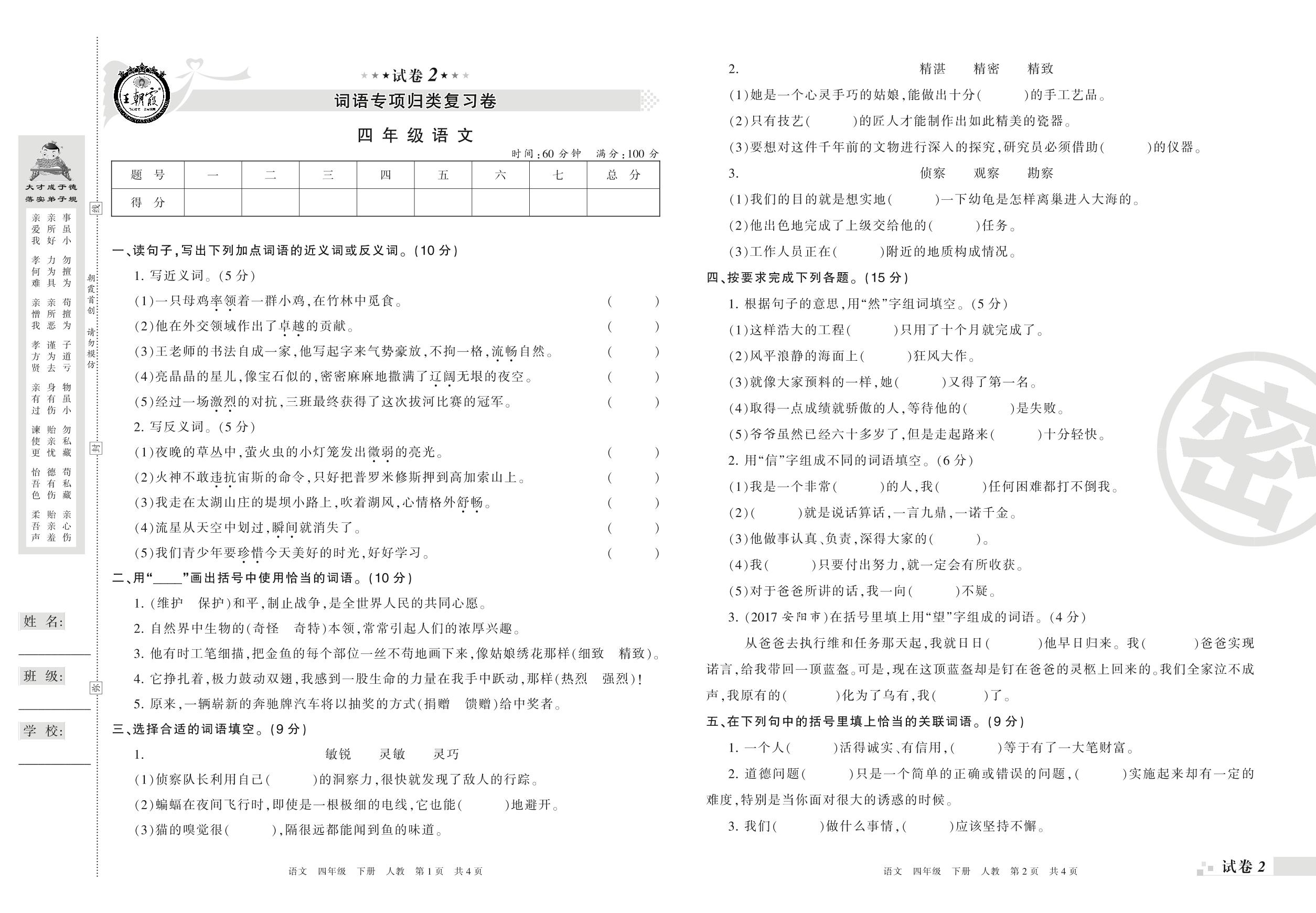 王朝霞期末专项卷——词语专项归类复习卷四年级下册语文(人教版)_R210801231429【2】