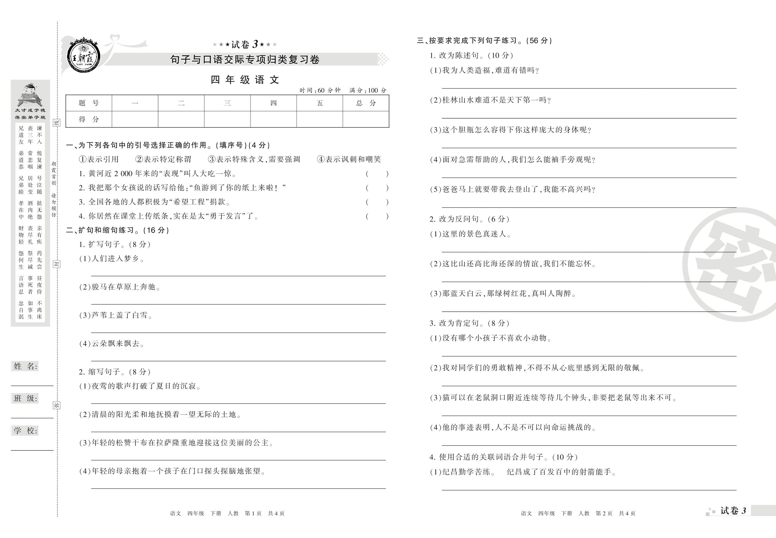 王朝霞期末专项卷——句子与口语交际专项归类复习卷四年级下册语文(人教版)_R210801231434【3】