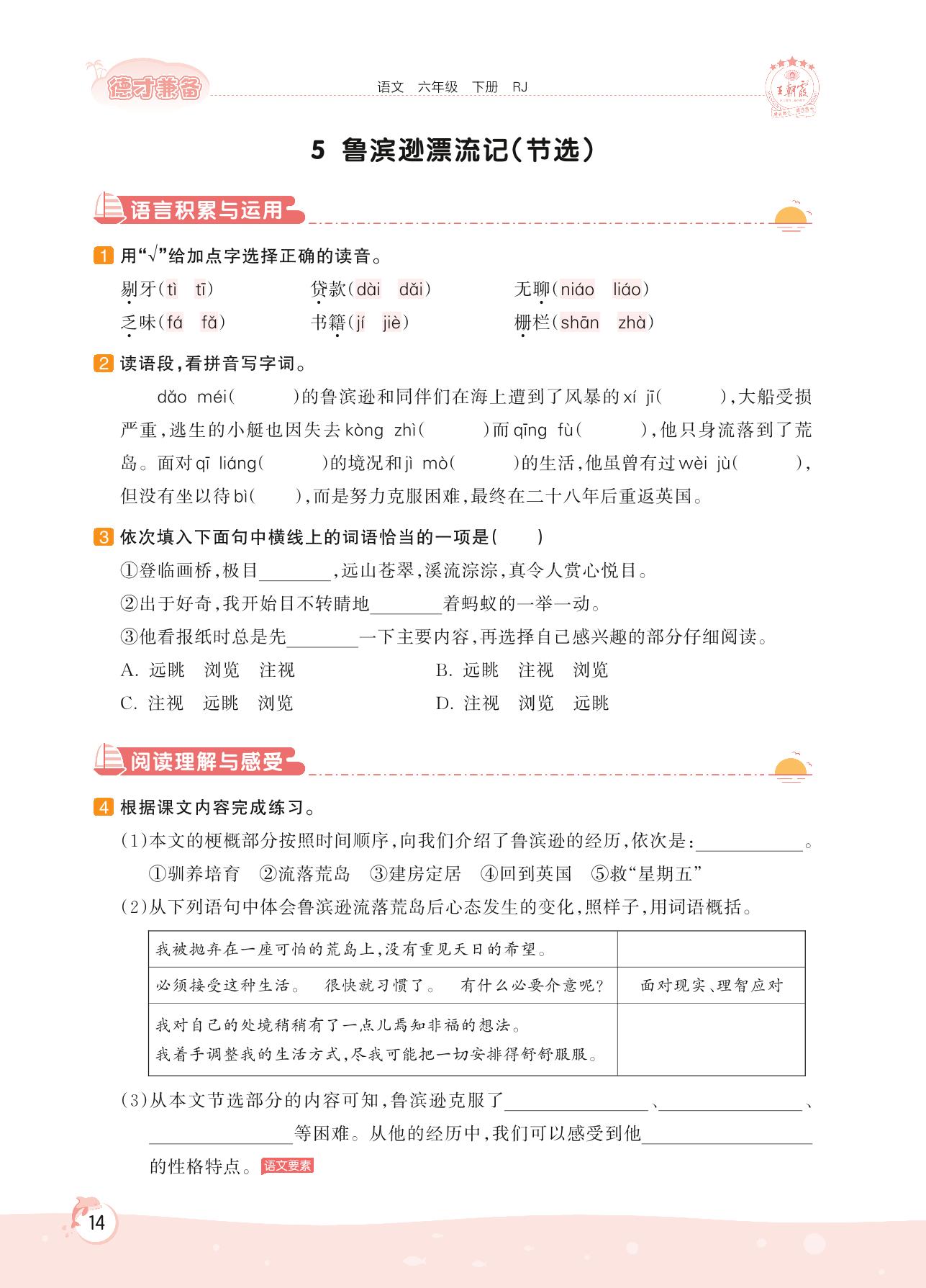 2022下册六年级语文人教版 第二单元 外国文学名著——5 鲁滨逊漂流记(节选)