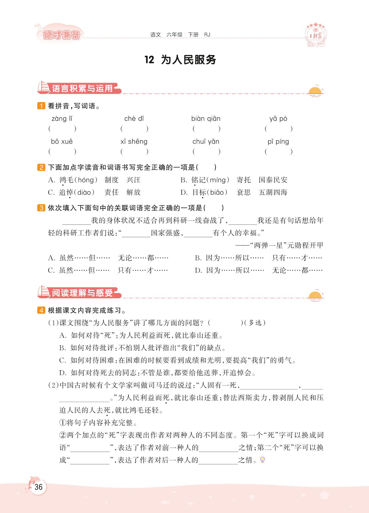 2022下册六年级语文人教版 第四单元 理想和信念——12 为人民服务
