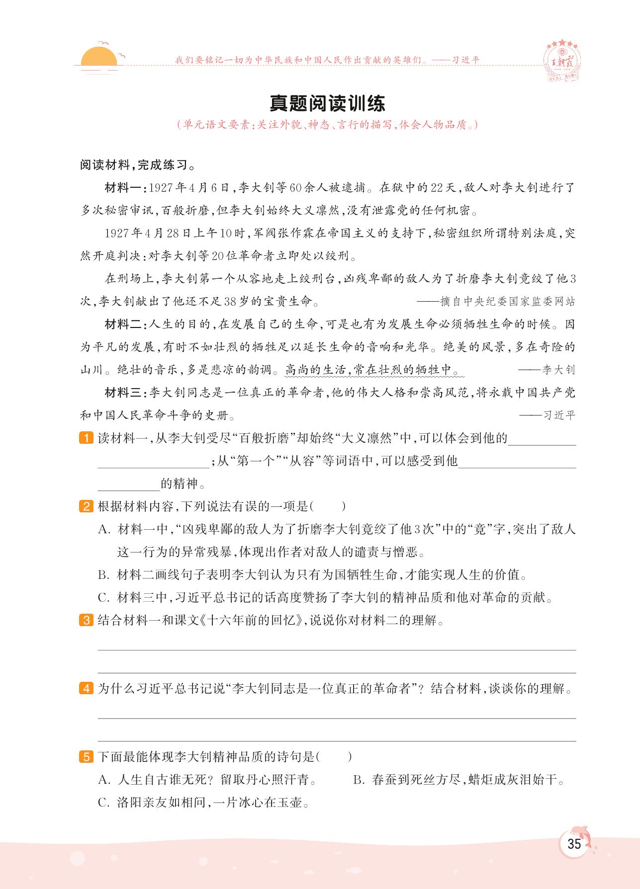2022下册六年级语文人教版 第四单元 理想和信念——真题阅读训练