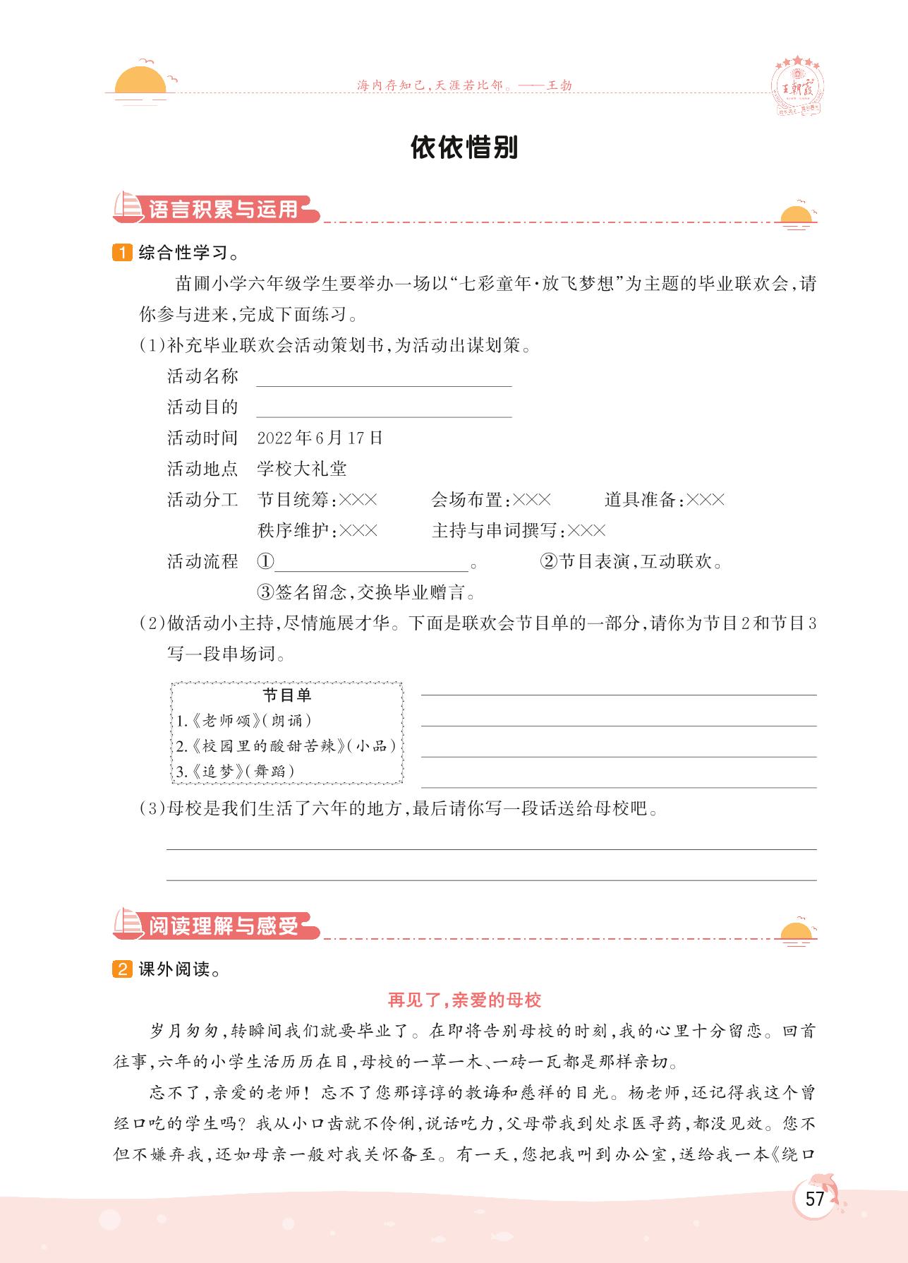 2022下册六年级语文人教版 第六单元 难忘小学生活——依依惜别