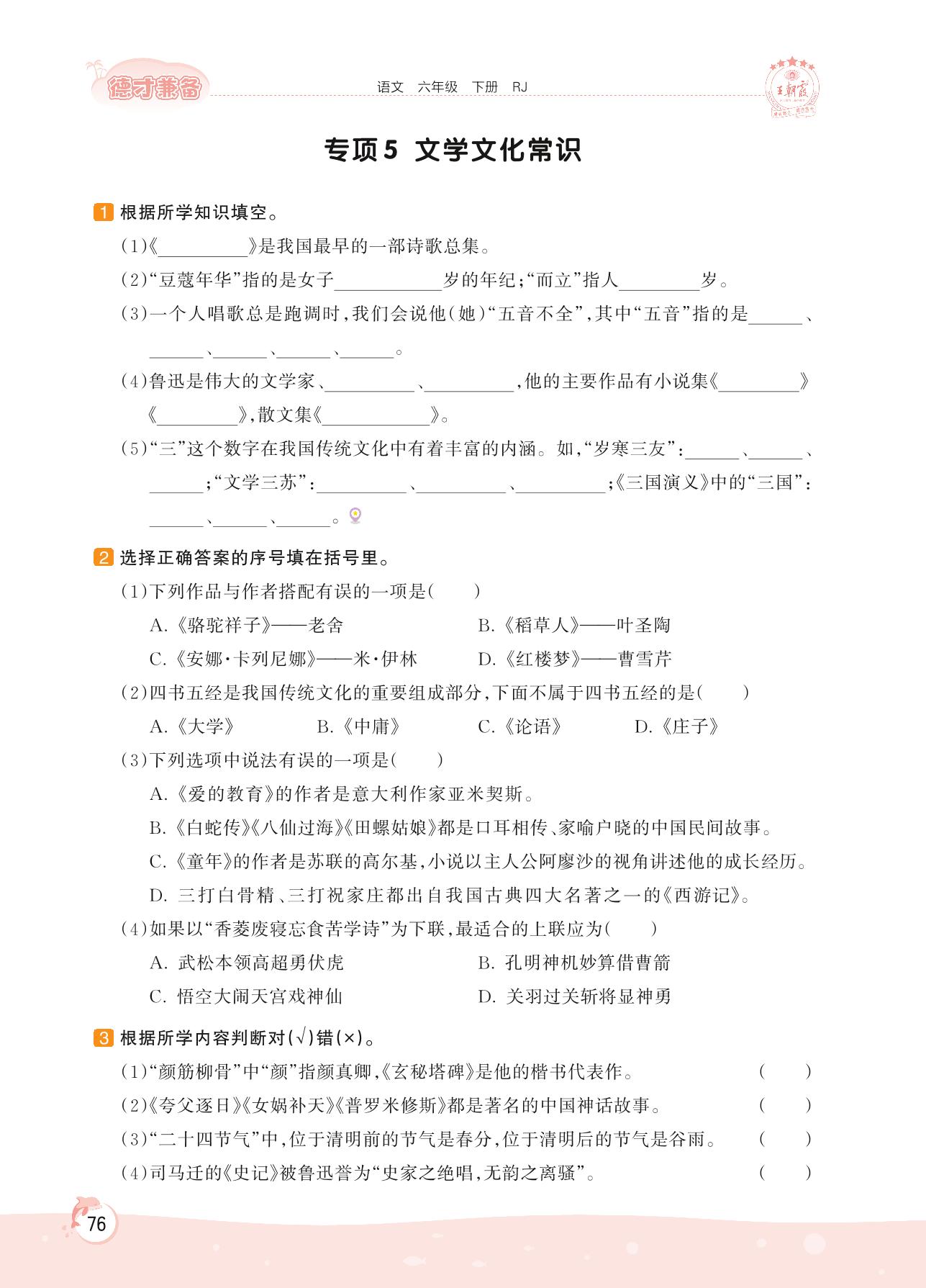 2022下册六年级语文人教版 新题新视野 专项训练——专项5 文学文化常识