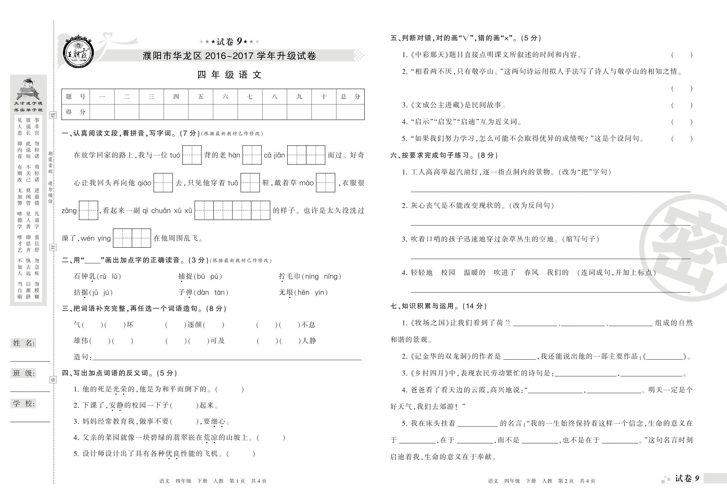 2016-2017学年第二学期濮阳市华龙区四年级语文试卷(人教版)【9】