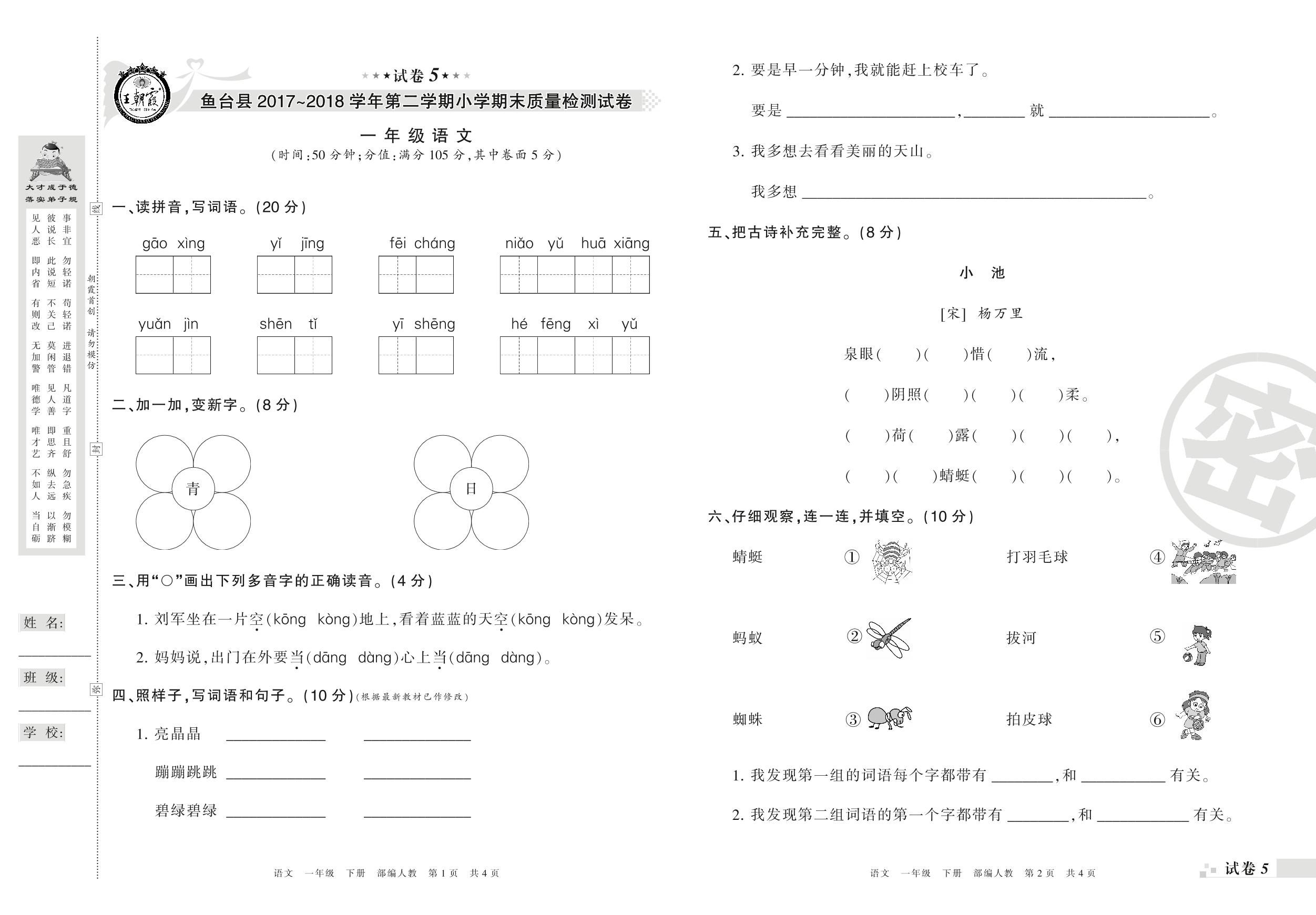 2017-2018学年第二学期济宁市鱼台县一年级语文试卷(人教版)【5】