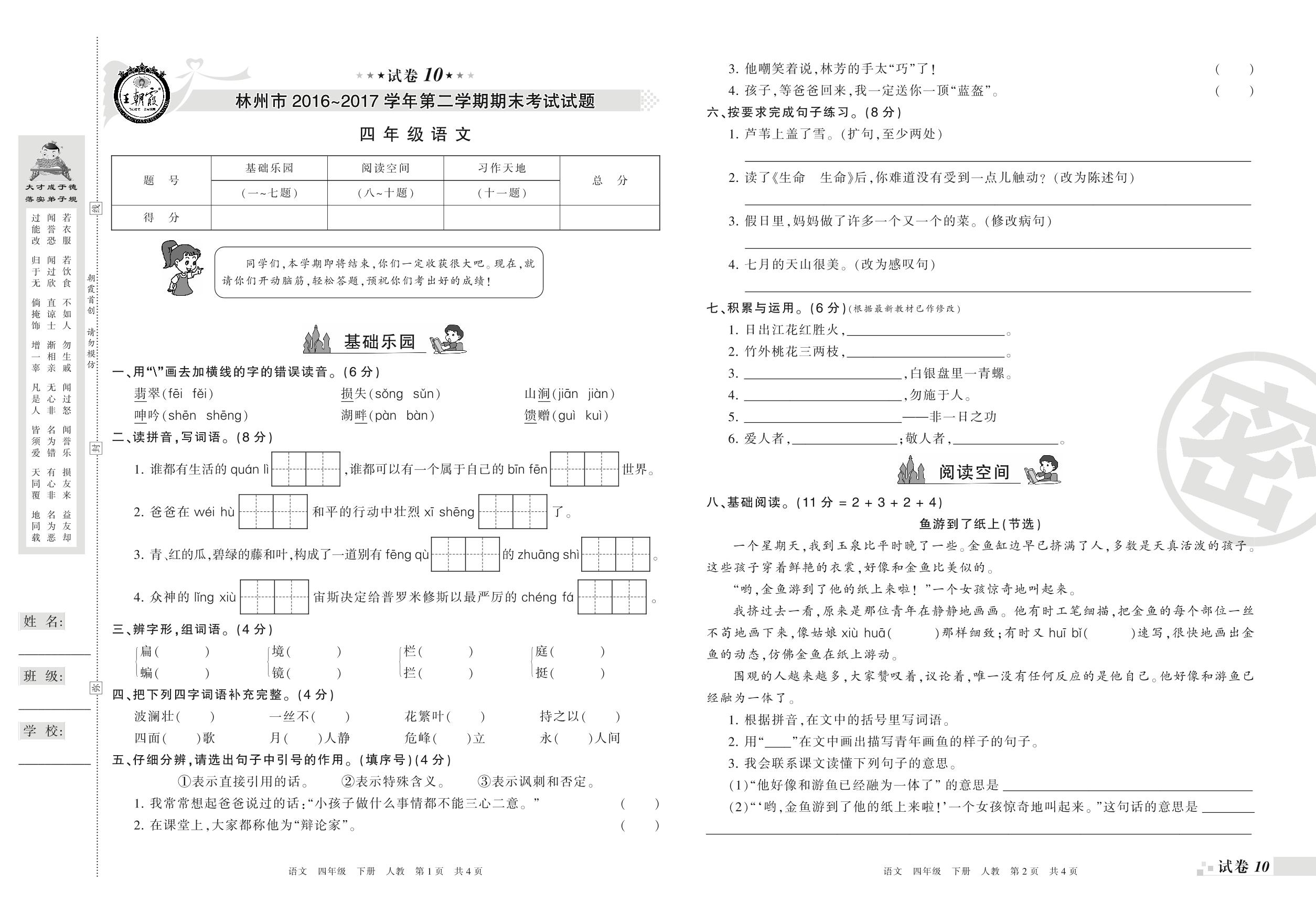2016-2017学年第二学期林州市四年级语文试卷(人教版)【10】