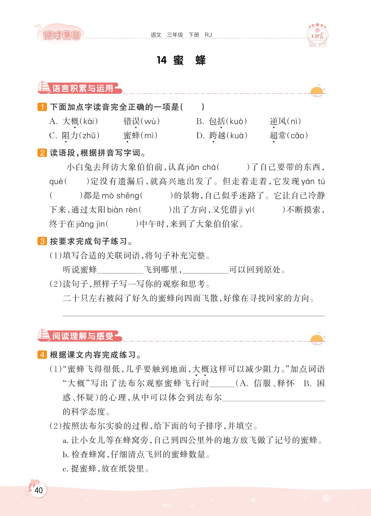 2022下册三年级语文人教版 第四单元 观察与发现——14 蜜蜂