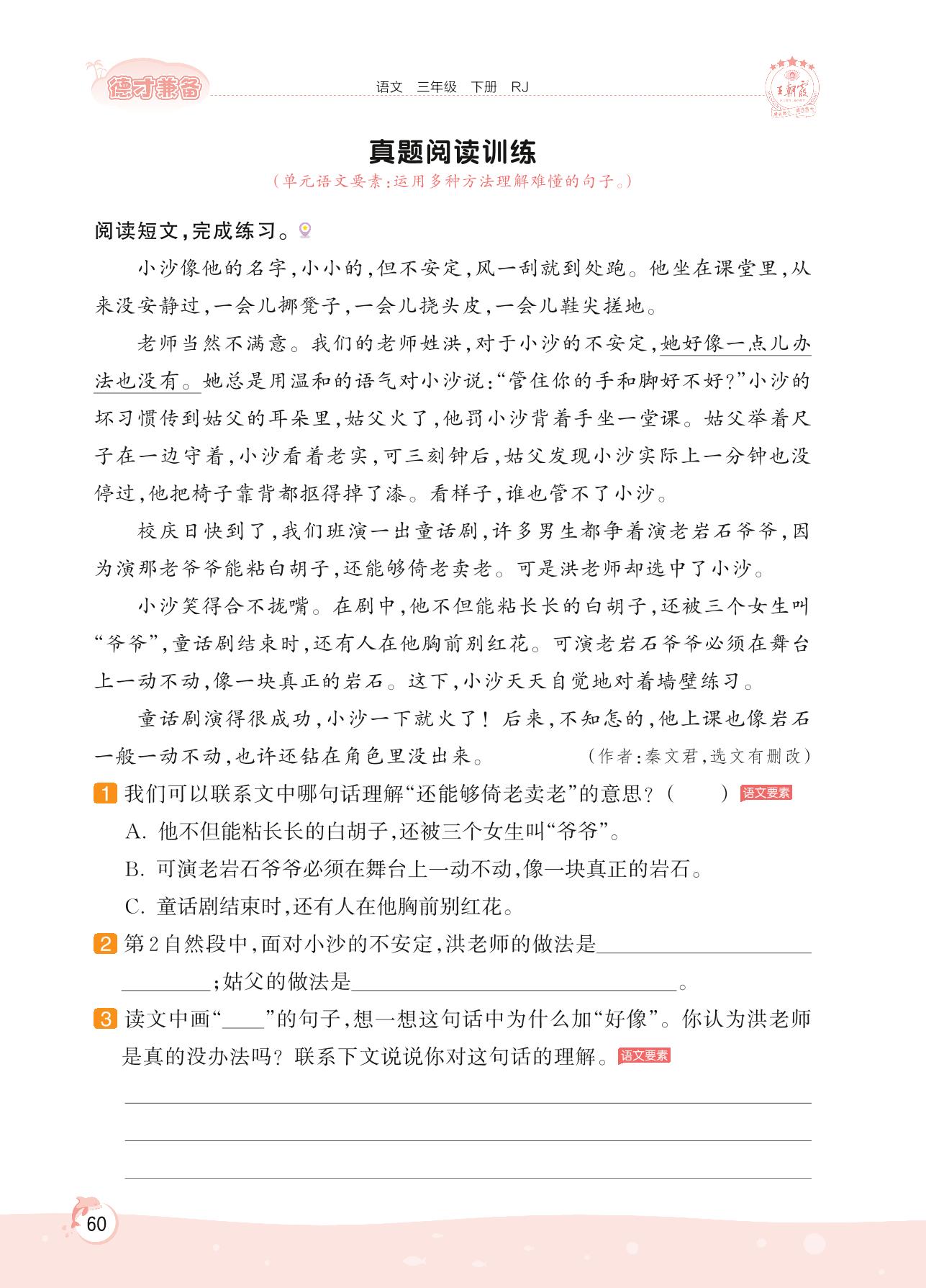 2022下册三年级语文人教版 第六单元 多彩童年——真题阅读训练
