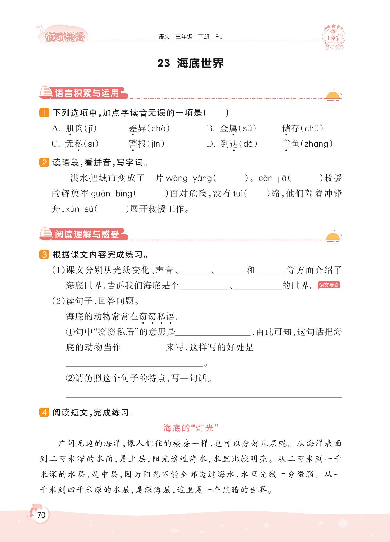 2022下册三年级语文人教版 第七单元 奇妙的世界——23 海底世界