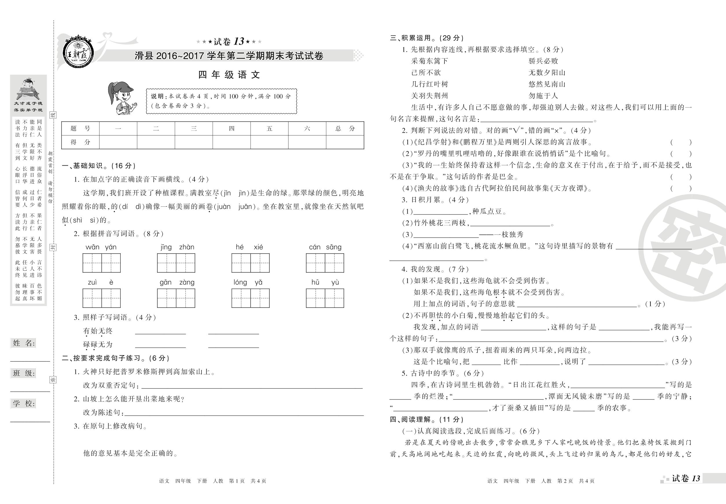 2016-2017学年第二学期安阳市滑县四年级语文试卷(人教版)【13】